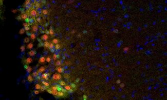 Immunohistochemical staining of a mouse olfactory bulb for T-bet (red) and Tbr2 (green) shows their expression in mitral and tufted cells.