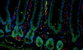 Immunohistochemical staining of a mouse small intestine section using Lyve1 (green) for lymphatic endothelial cells and CD31 (red) blood endothelial cells.
