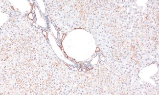 Immunodetection of Lyve1 in lymphatic and liver sinusoidal endothelial cells in a mouse liver.
