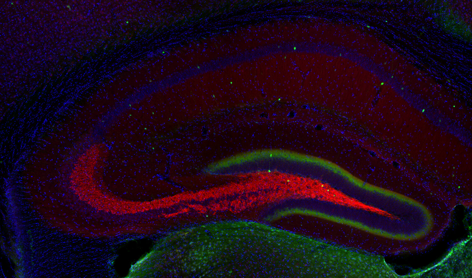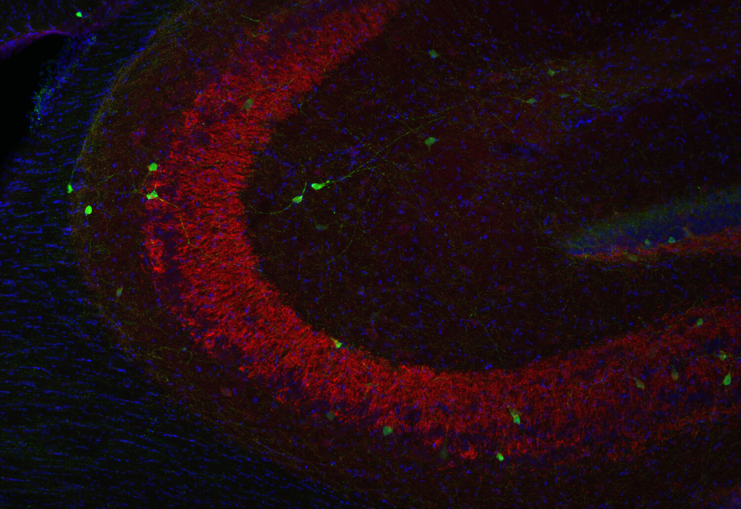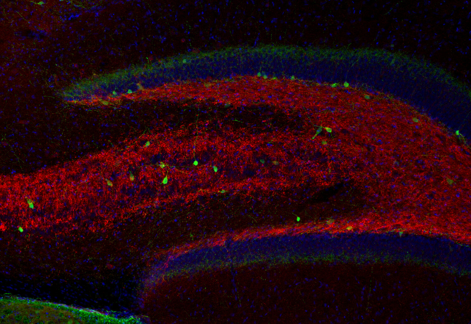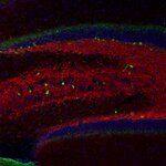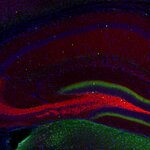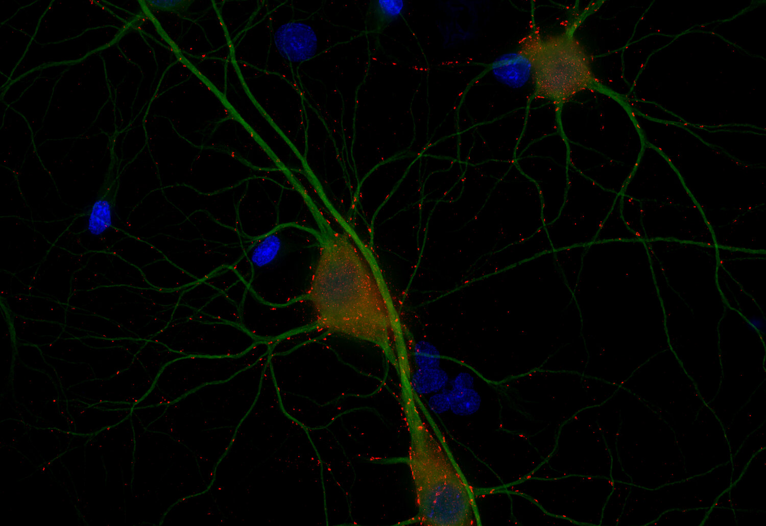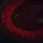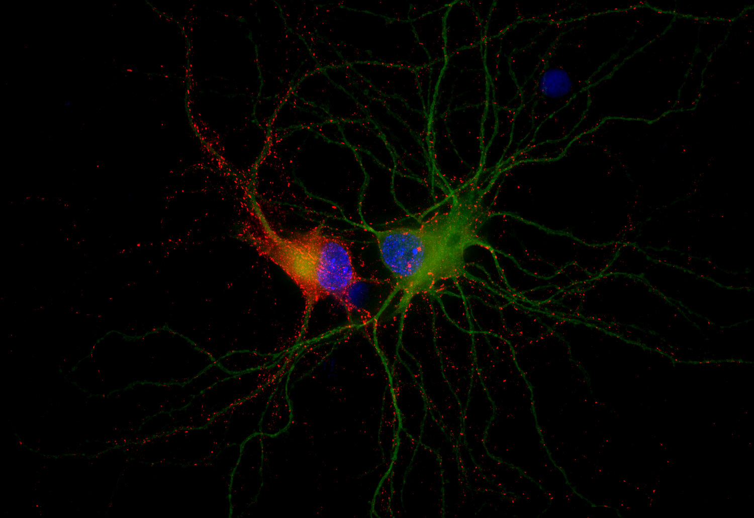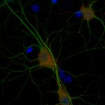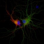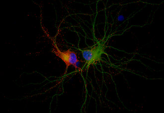 Indirect immunostaining of rat hippocampus neurons with Synaptoporin (red) and MAP2 (green)