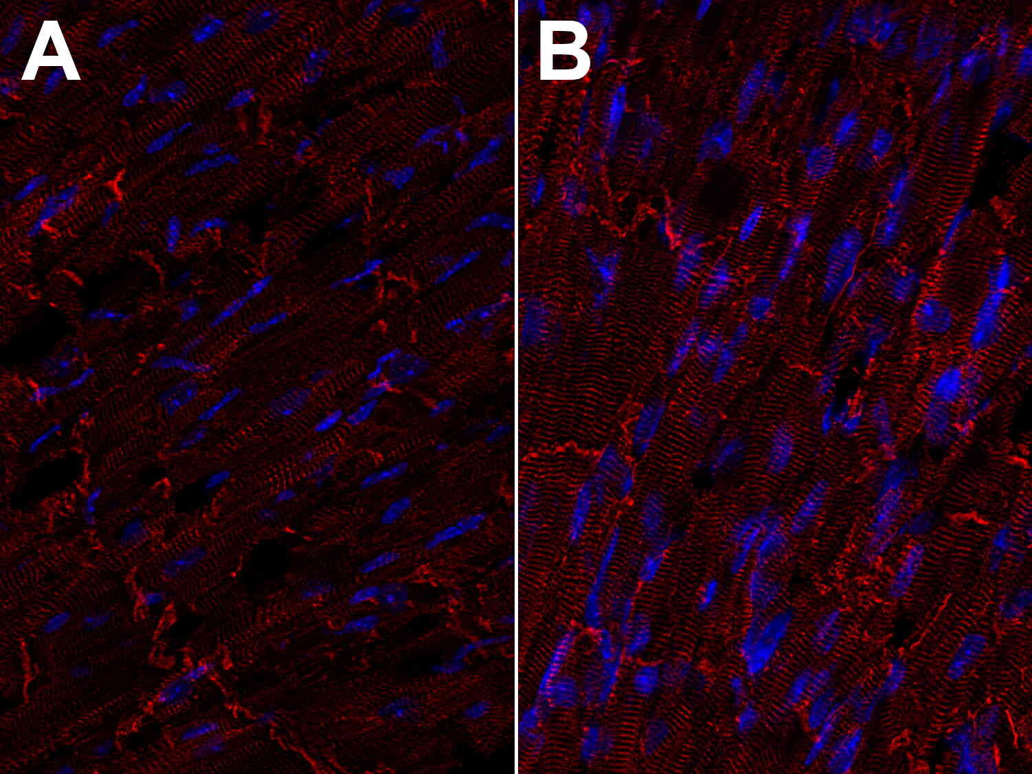 Expression of Desmin in cardiomyocytes (red) and CD31 in vascular endothelial cells (green) in a mouse heart.