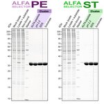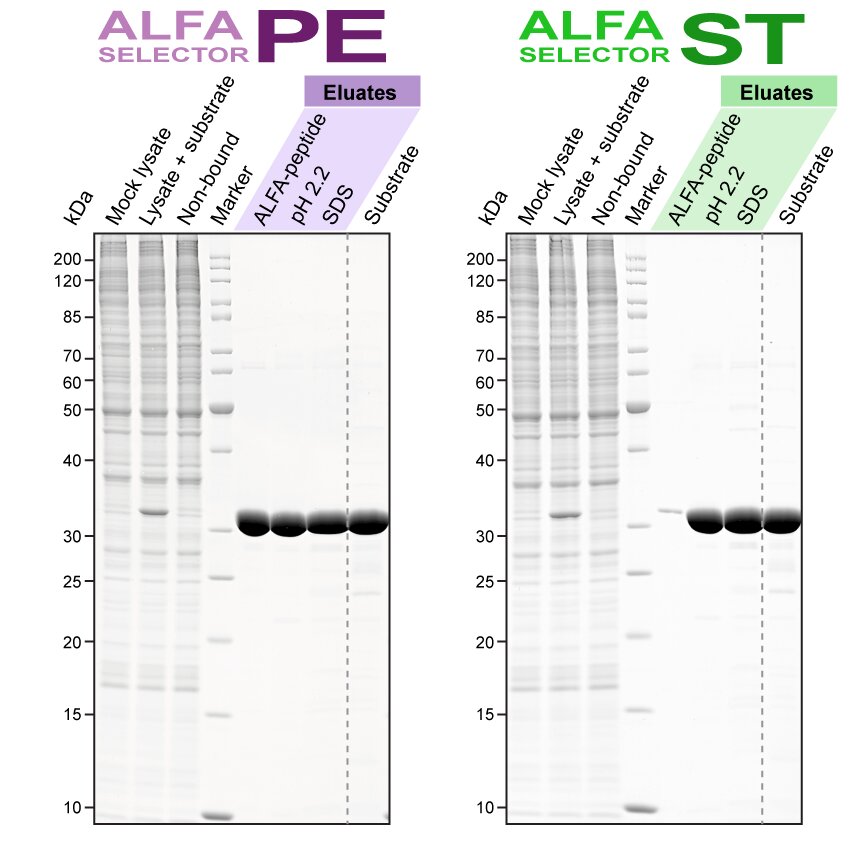 For immunoprecipitations we offer two types of ALFA Selector resins. Both ALFA Selectors are based on covalently coupled nanobodies that specifically recognize ALFA-tagged targets. ALFA Selector ST (for Super-Tight) offers the highest possible affinity for ALFA-tagged targets, which can be eluted under acidic or denaturing conditions. ALFA Selector PE (for Peptide Elution) displays an engineered nanobody with lower affinity (Kd ~11 nM), which is optimized for peptide elution under physiological conditions. ALFA Selector CE (link) (for cold elutable) carries an engineered nanobody with lower affinity (Kd 100 nM), which is optimized for peptide elution under physiological conditions at low temperature (4°C). All Selector resins feature low non-specific protein adsorption and therefore allowing clean and meaningful immunoprecipitations. Due to the covalent and oriented immobilization, the immobilized nanobodies will stay on the resin even when using harsh denaturing and/or reducing conditions for elution. In contrast to conventional immunoprecipitations, eluates from both ALFA Selectors will therefore be free from large amounts of antibody fragments.