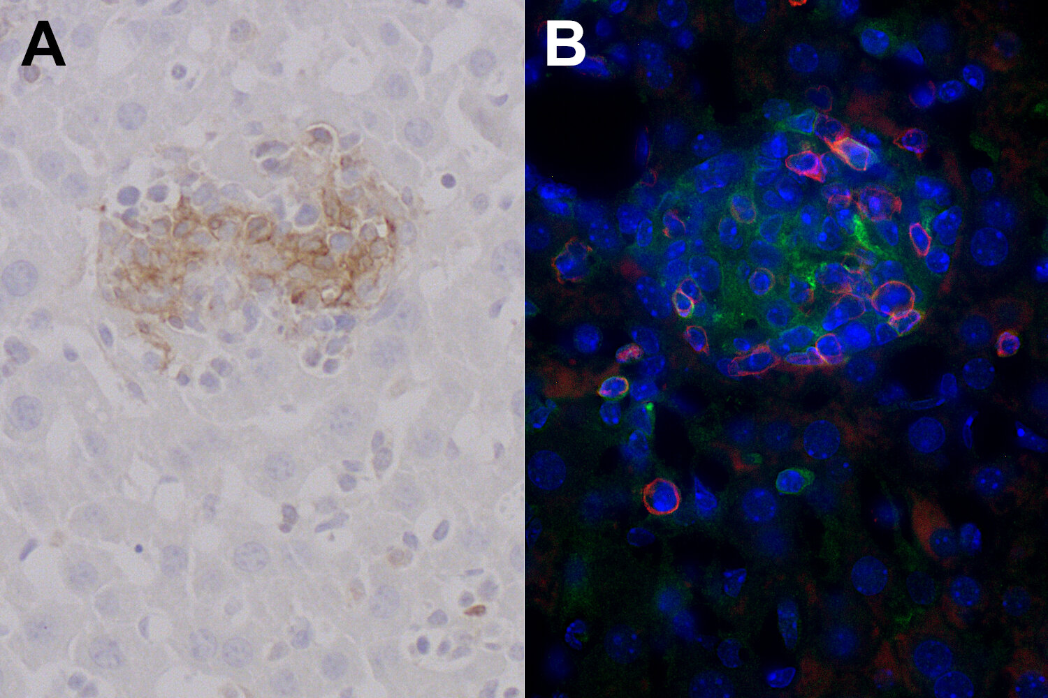 Figure 7: Immunohistochemical detection of CD86 (cat. no. HS-466 003, 1:400) in a formalin fixed paraffin embedded T. gondii infected mouse liver section revealing CD86 positive cells in cell aggregates. B: Indirect immunostaining of a formalin fixed paraffin embedded T. gondii infected mouse liver section with rat anti-CD4 (cat. no. HS-360 117, 1:100; red) and rabbit anti-CD86 (cat. no. HS-466 003, 1:200; green). Nuclei have been visualized by DAPI staining (blue).