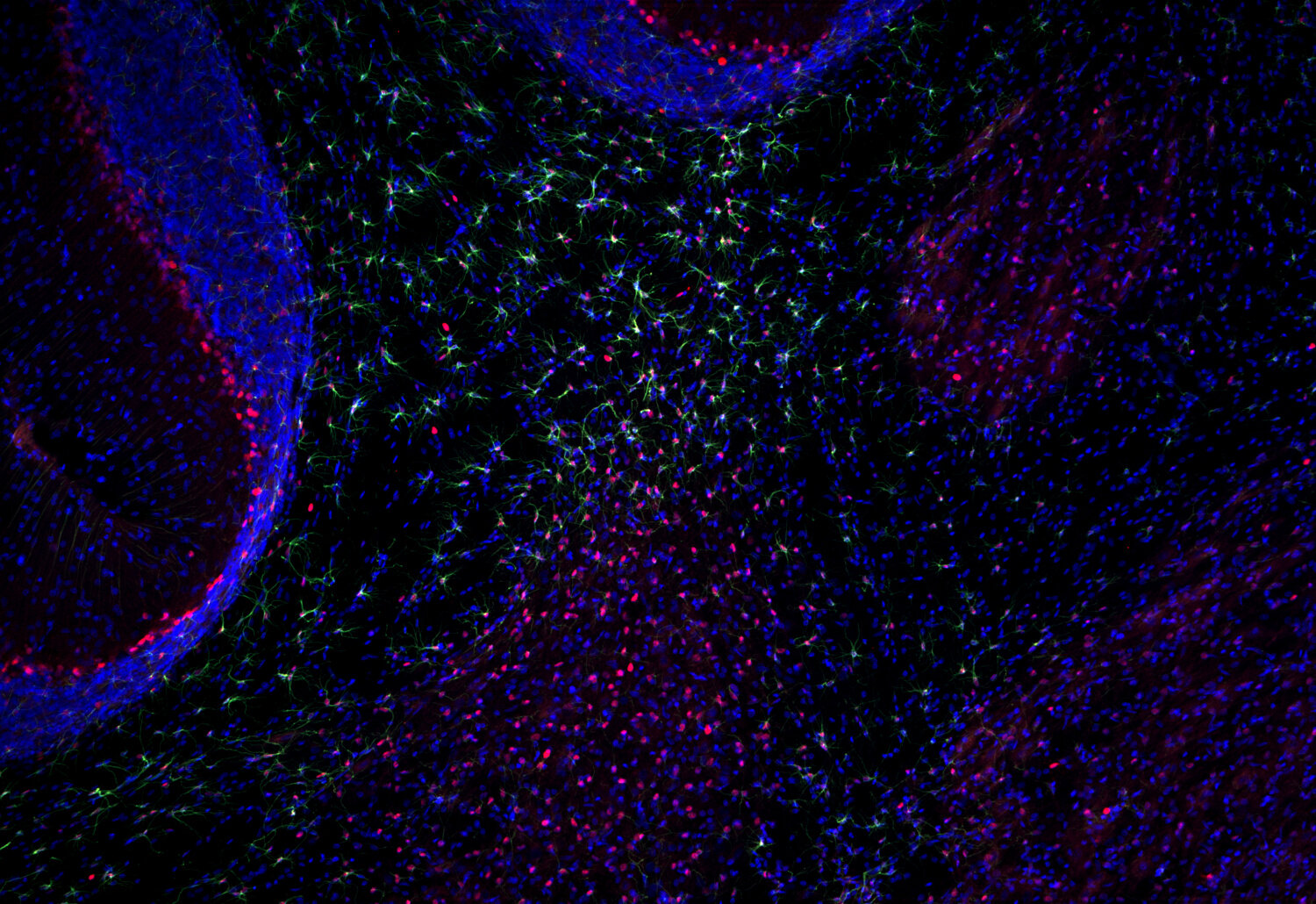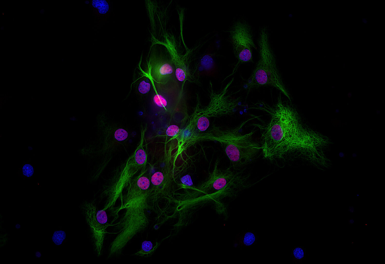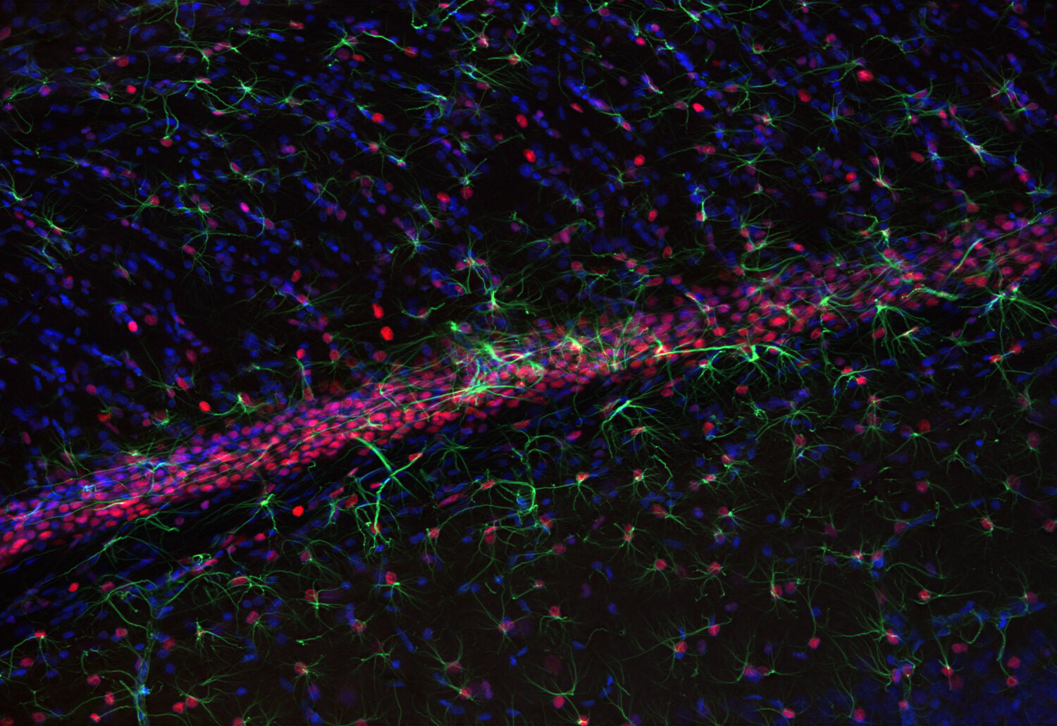 Frequently, neural stem cells also express GFAP. In addition many types of brain tumors, probably derived from astrocytic cells, heavily express GFAP. This protein is also found in the lens epithelium, Kupffer cells of the liver, in some cells in salivary tumors and others.