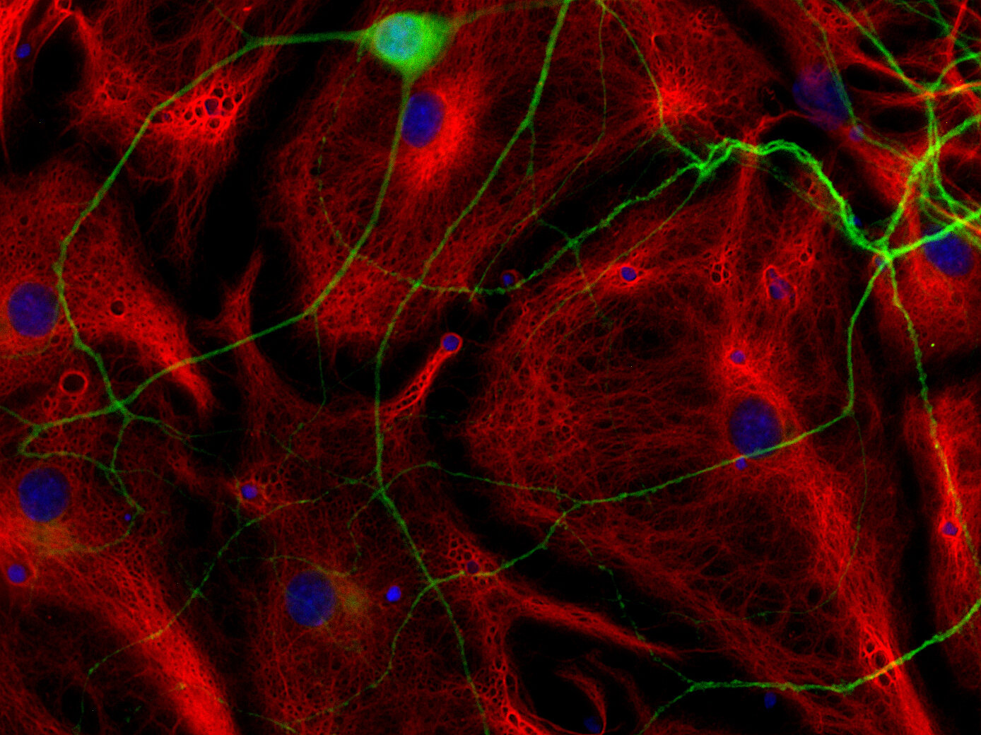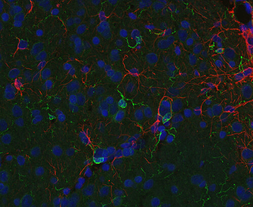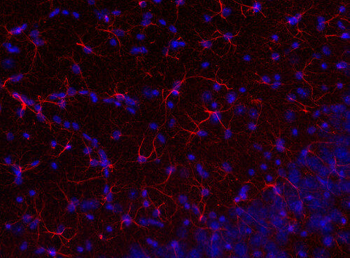 Frequently, neural stem cells also express GFAP. In addition many types of brain tumors, probably derived from astrocytic cells, heavily express GFAP. This protein is also found in the lens epithelium, Kupffer cells of the liver, in some cells in salivary tumors and others.