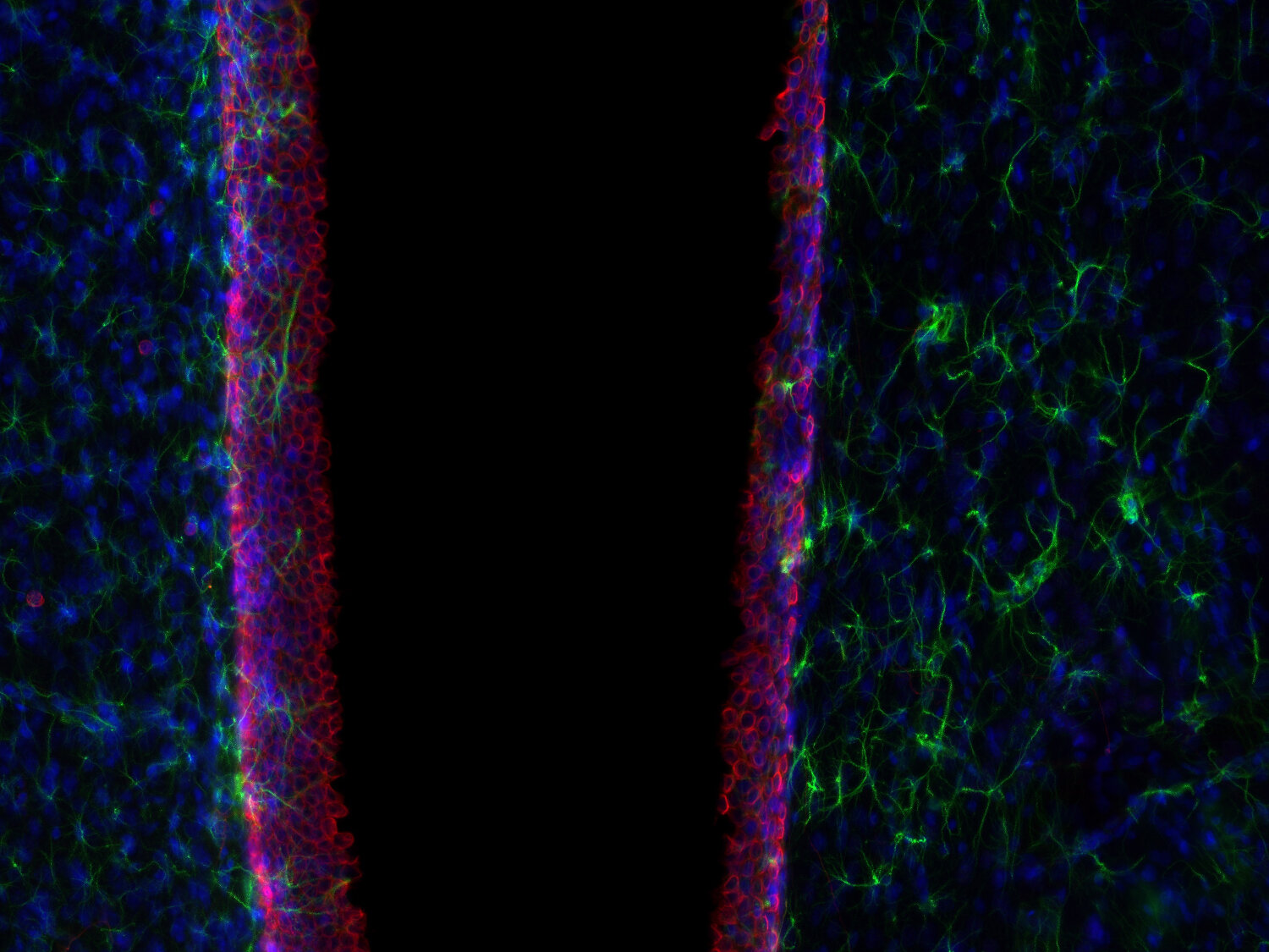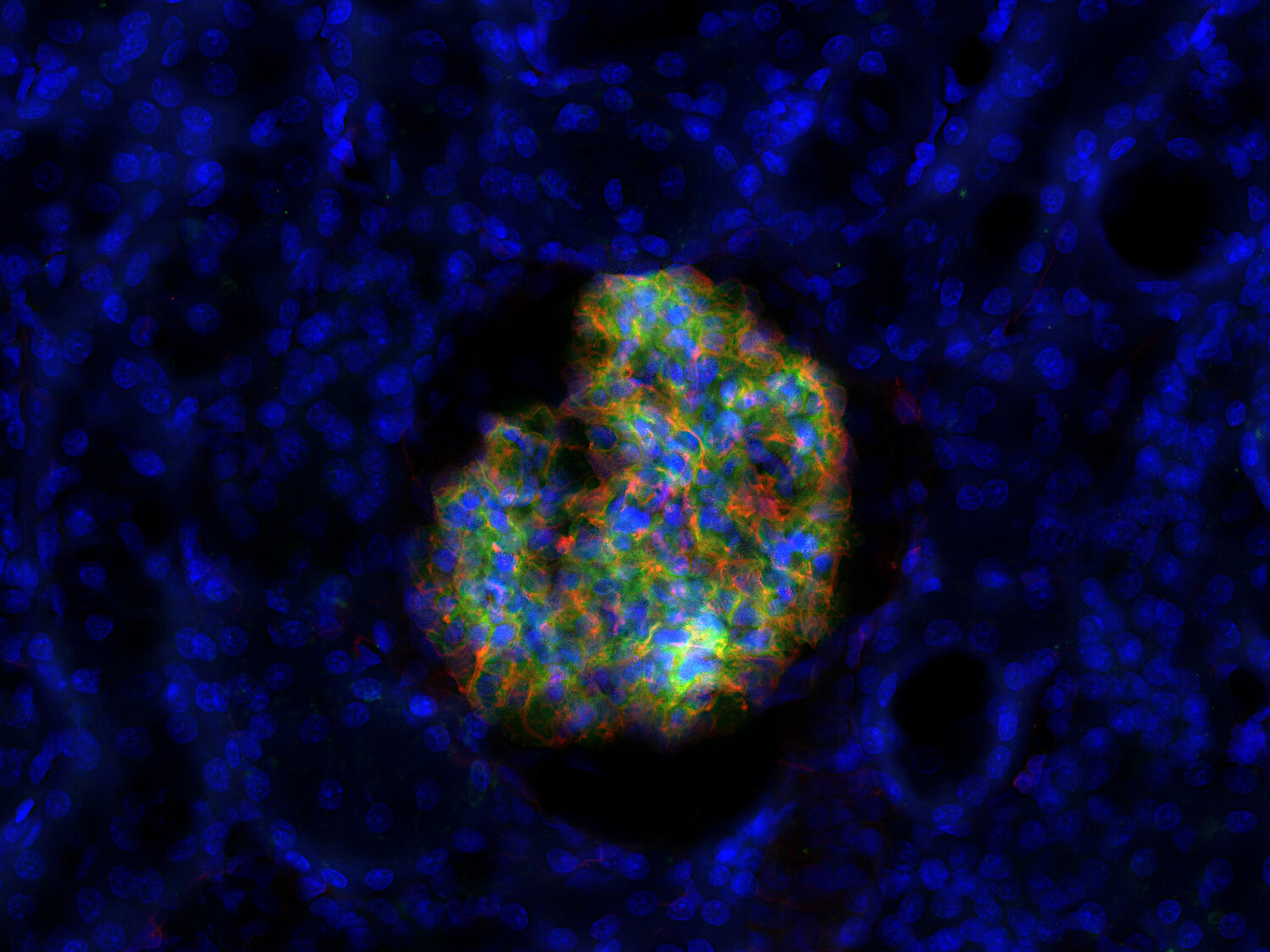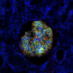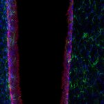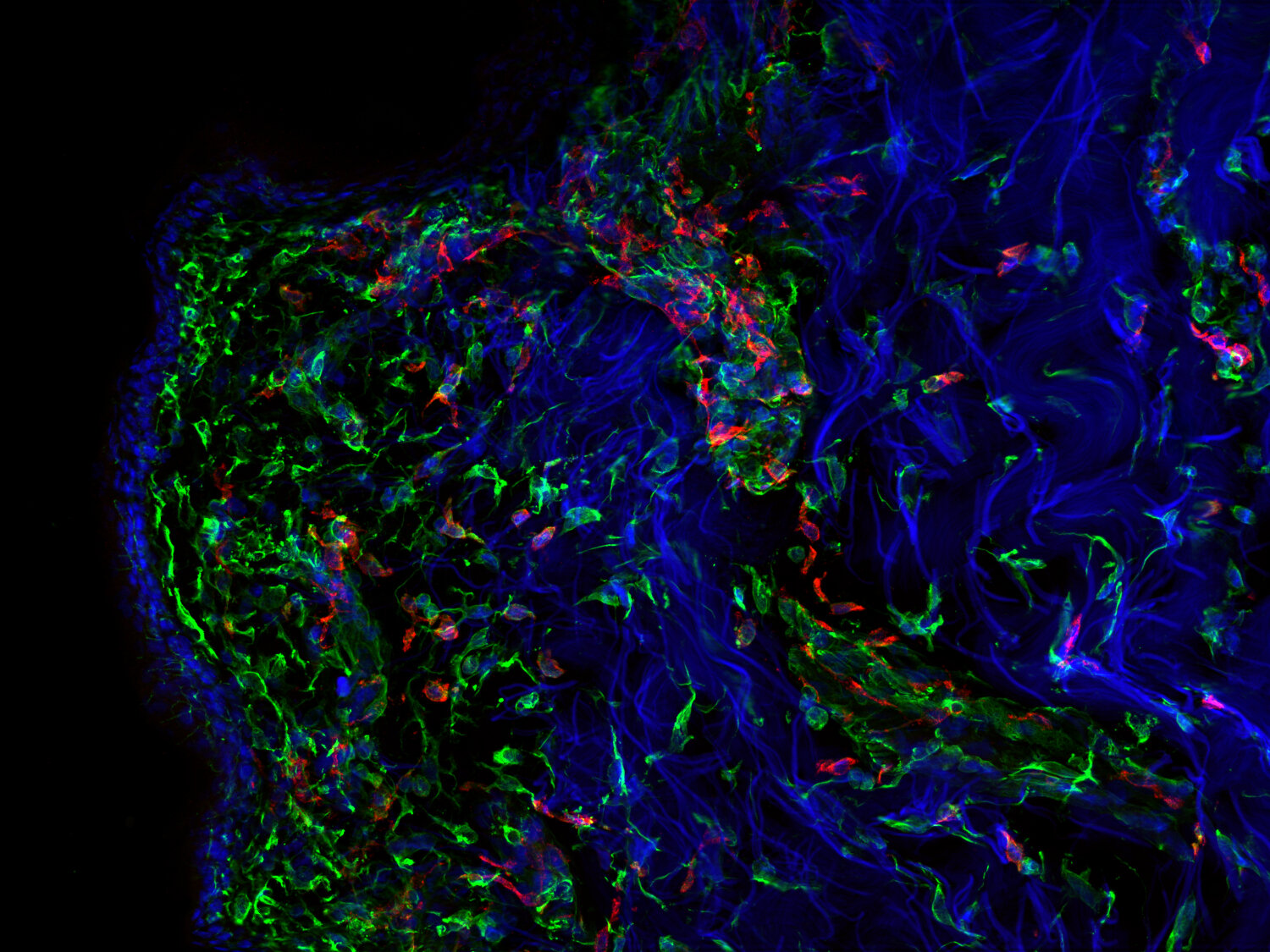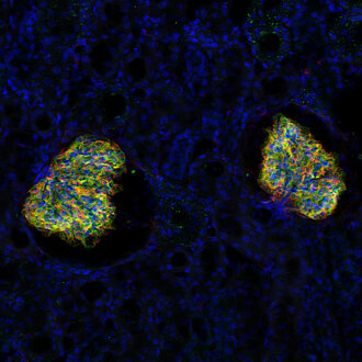 Vimentin (red) and Synaptopodin (green) staining in glomeruli of rat kidney