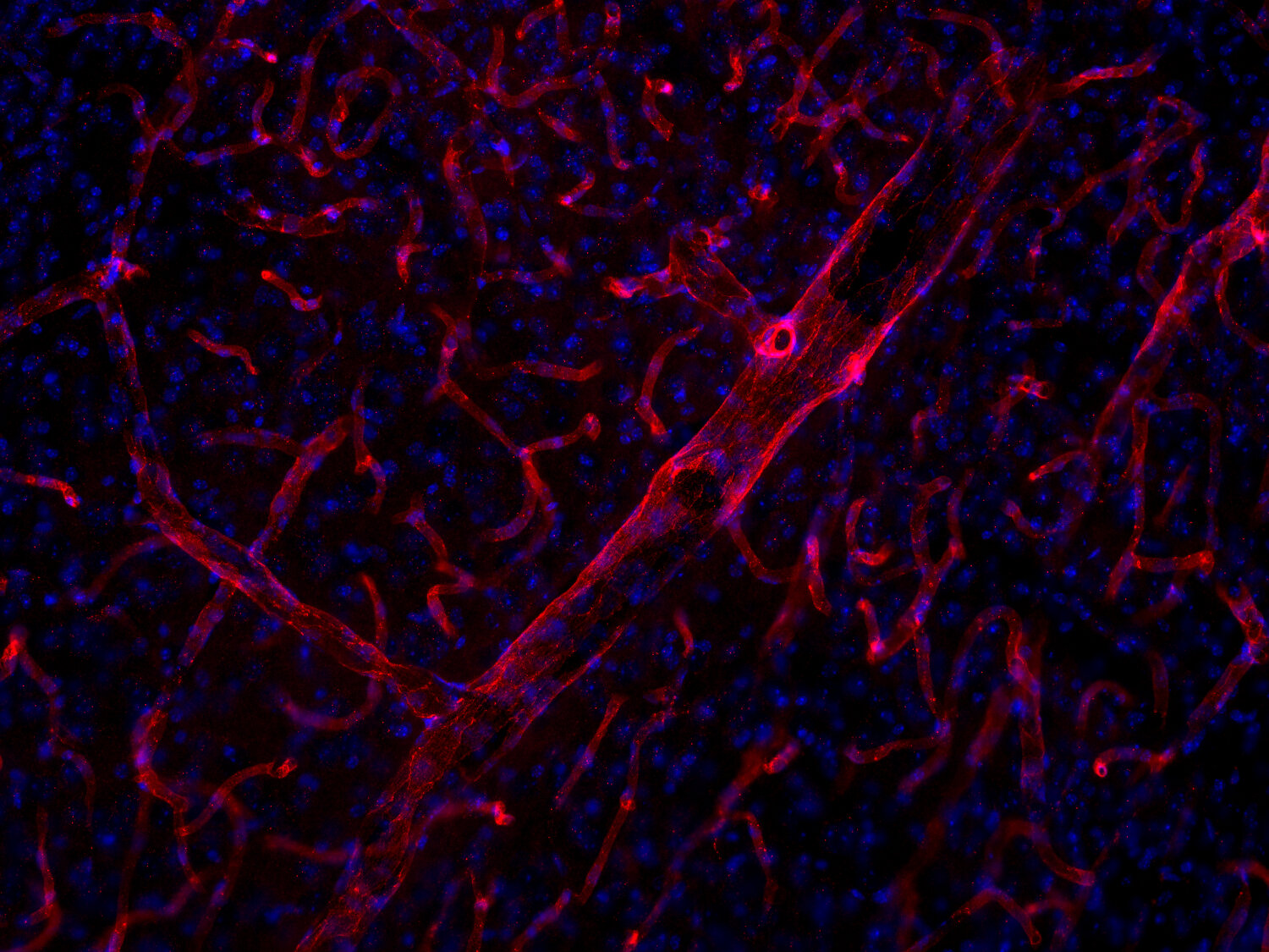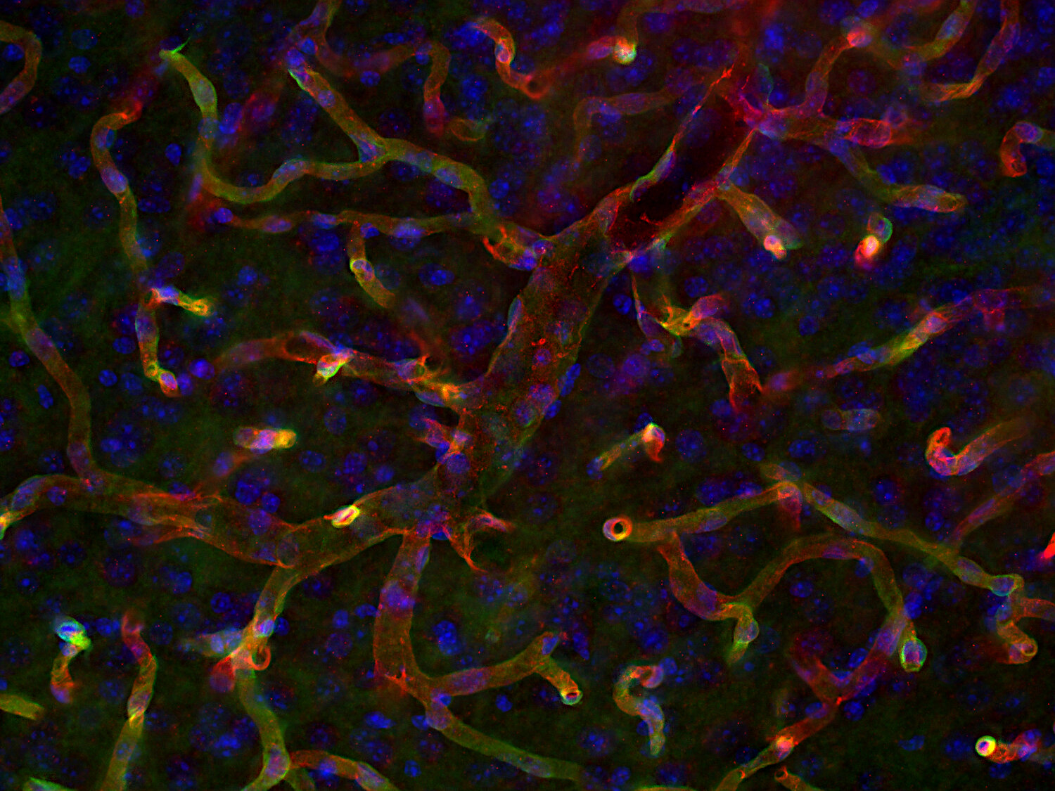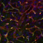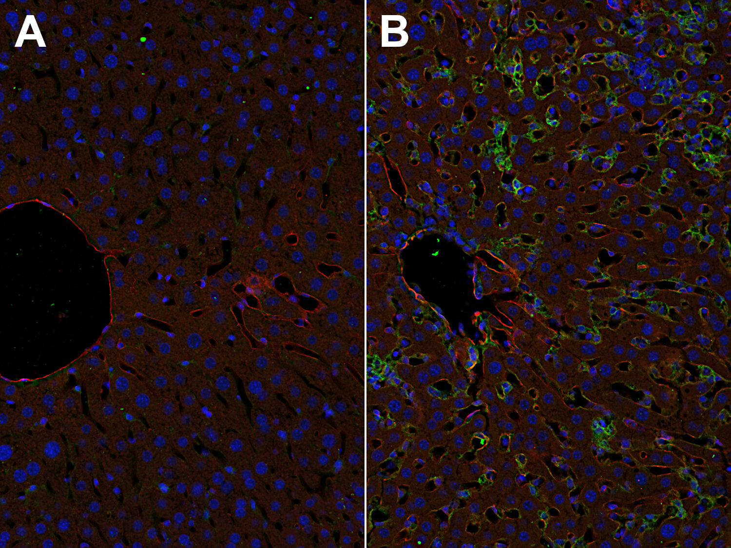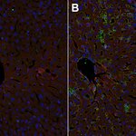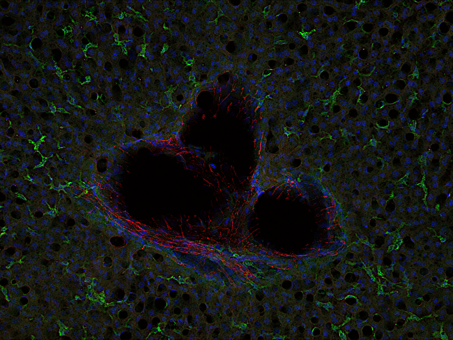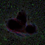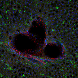 Mouse liver section stained with CD31 (red) and F4/80 (green)