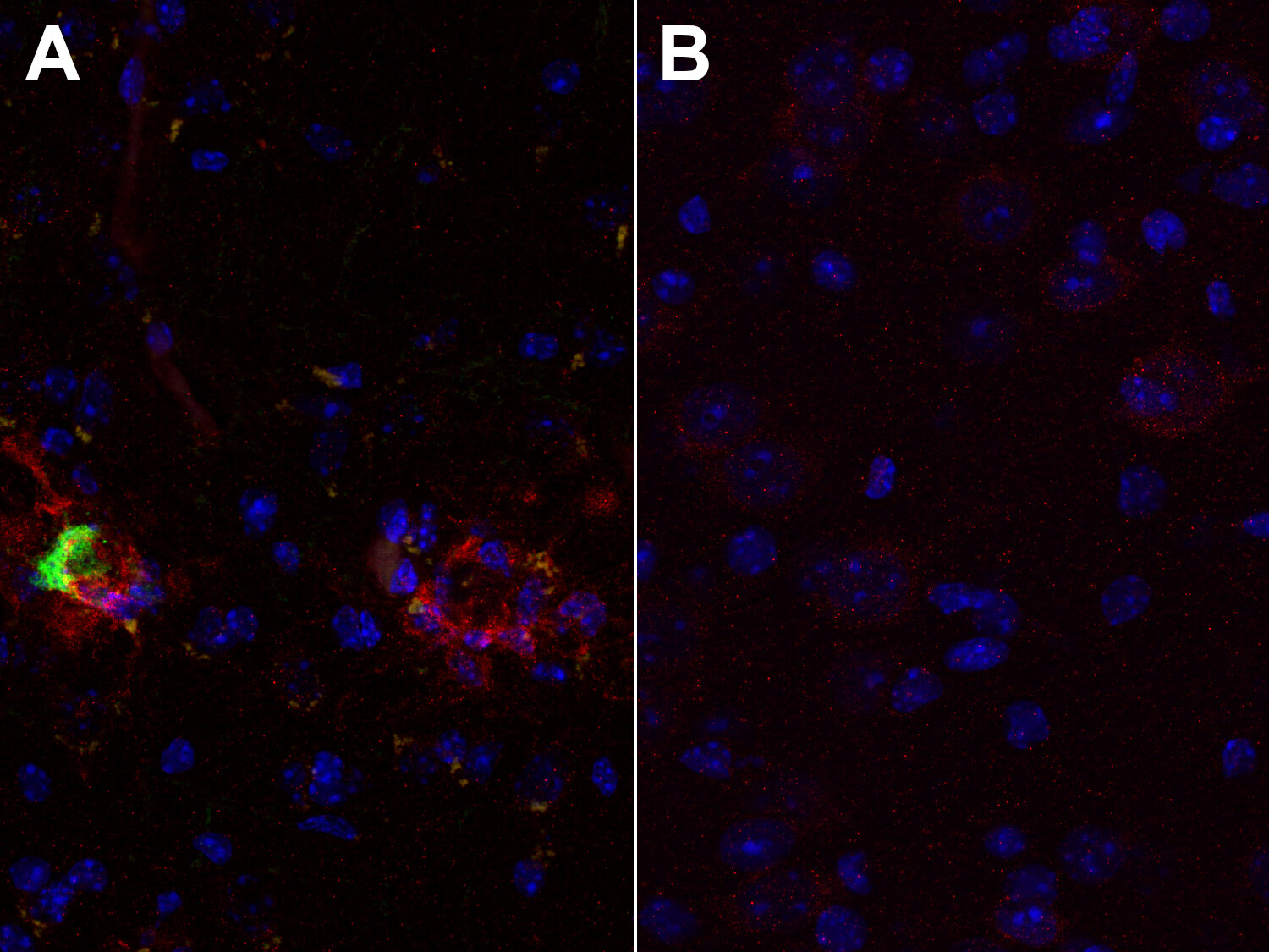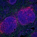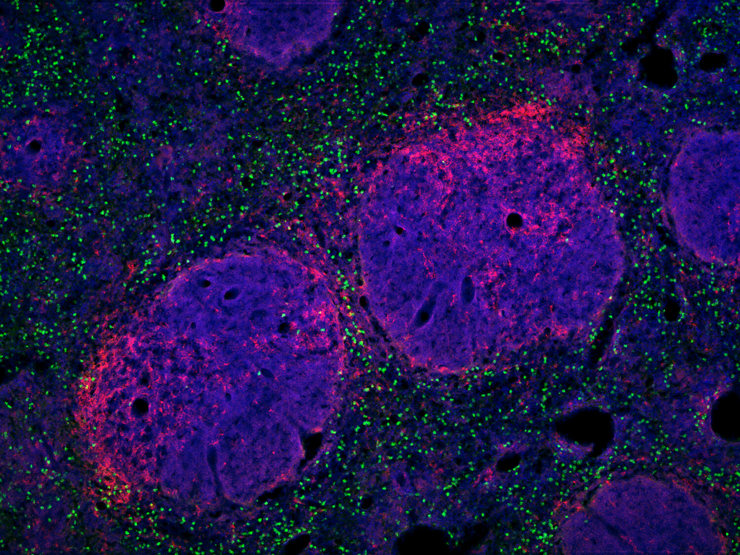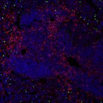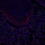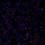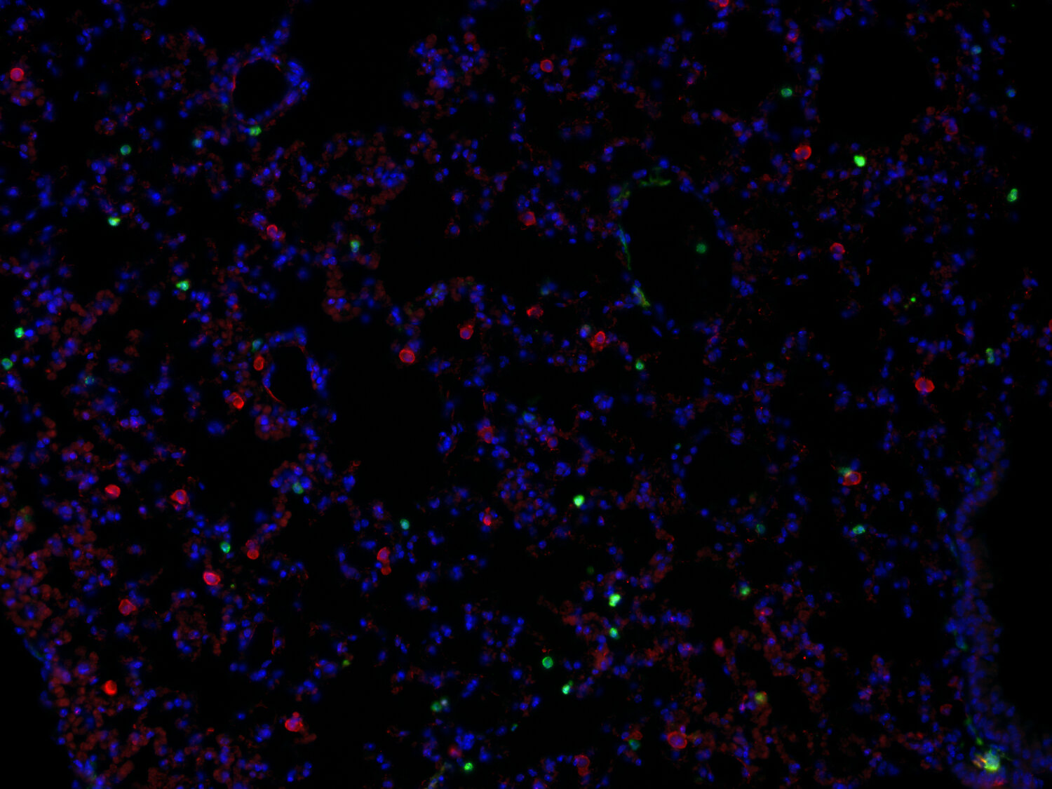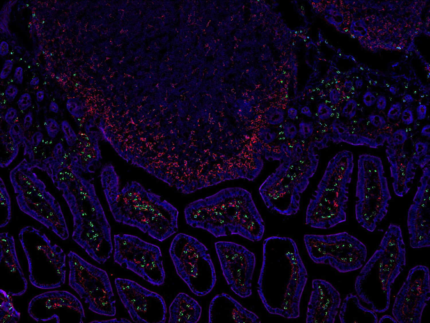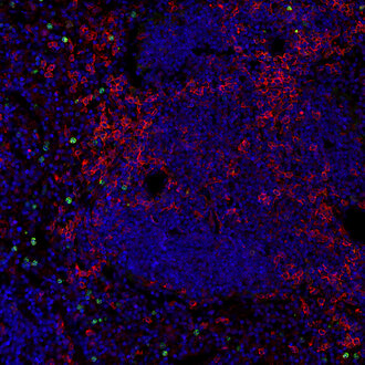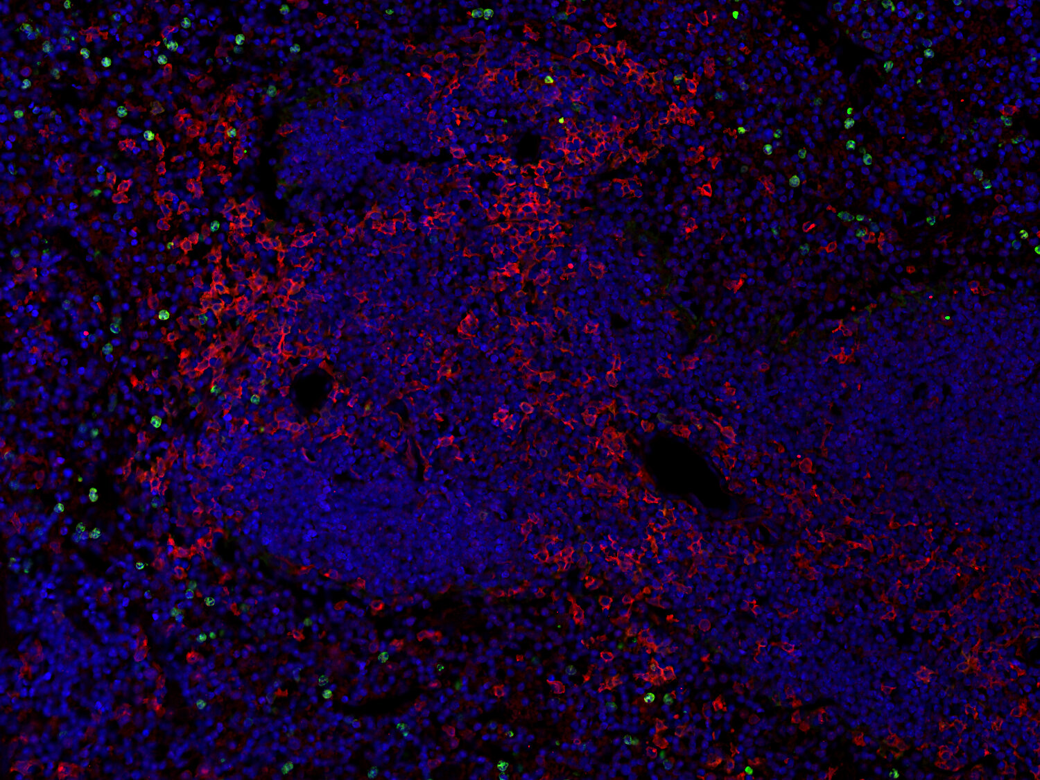 CD11c (red) and CD11b (green) positive cells in a mouse spleen