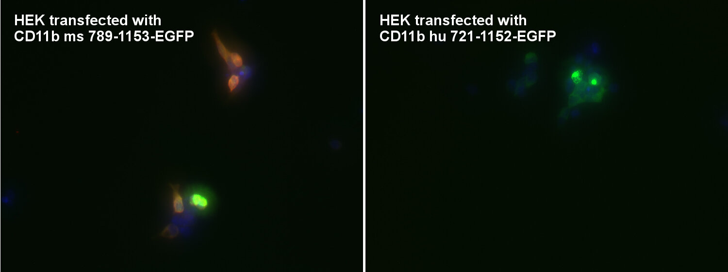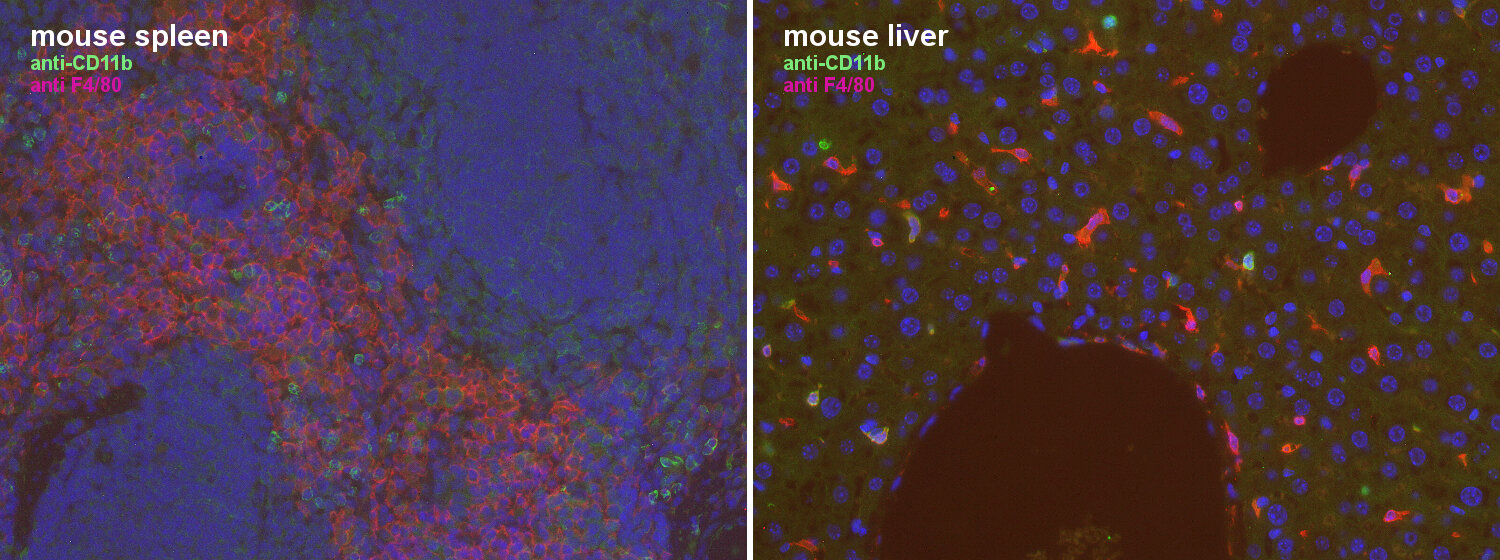CD11b also called integrin alpha-M (ITGAM) is one protein subunit that forms together with CD18 the heterodimeric integrin αMβ2 complex, also known as macrophage-1 antigen (Mac-1) or complement receptor 3 (CR3) (1). αMβ2 is expressed on polymorphonuclear neutrophils (PMN), monocytes, macrophages, some subsets of cytotoxic T lymphocytes, and NK cells. Antibodies against CD11b are frequently used to identify macrophages and microglia, however not all tissue-resident macrophages are CD11b positive. In the murine liver CD11b expression is rare and almost exclusively found on F4/80 negative cells (2). In the murine spleen CD11b+ cells are less numerous than F4/80+ cells, co-expression of CD11b and F4/80 is also rare and CD11b+ cells tend to be closer to the marginal zone (2). CD11b upregulation on residential alveolar macrophages is a marker of acute and chronic lung inflammation in mice (3). Also, in the brain CD11b is markedly increased during microglial activation (4).