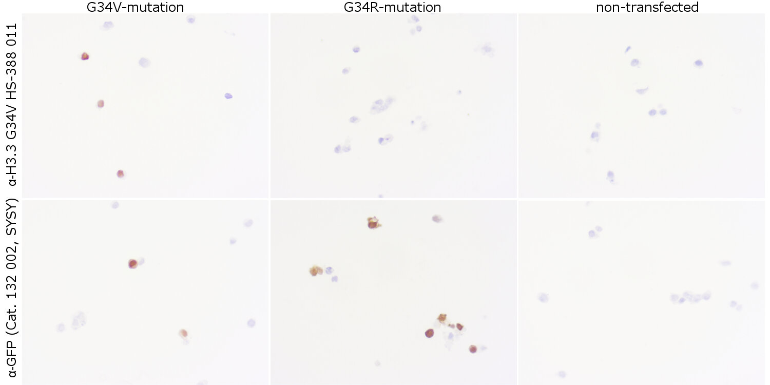 | Specificity | Specific for the H3.3 G34V mutant. Negligible cross-reactivity to H3.3 G34R, and no cross-reactivity to unmutated H3.3. K.O. validated |