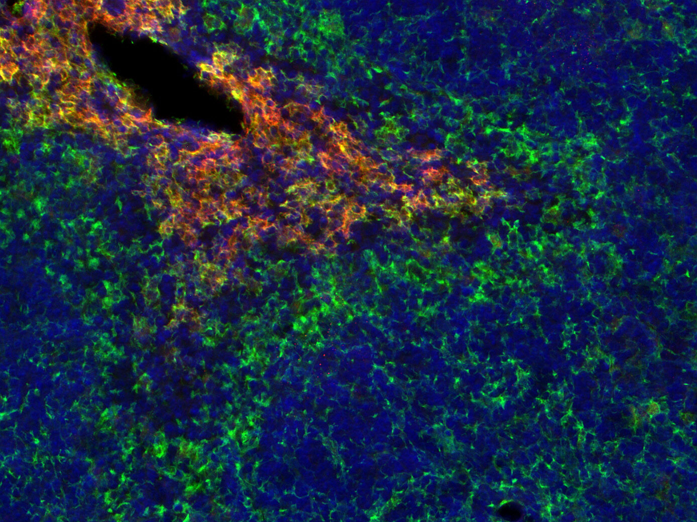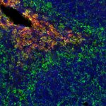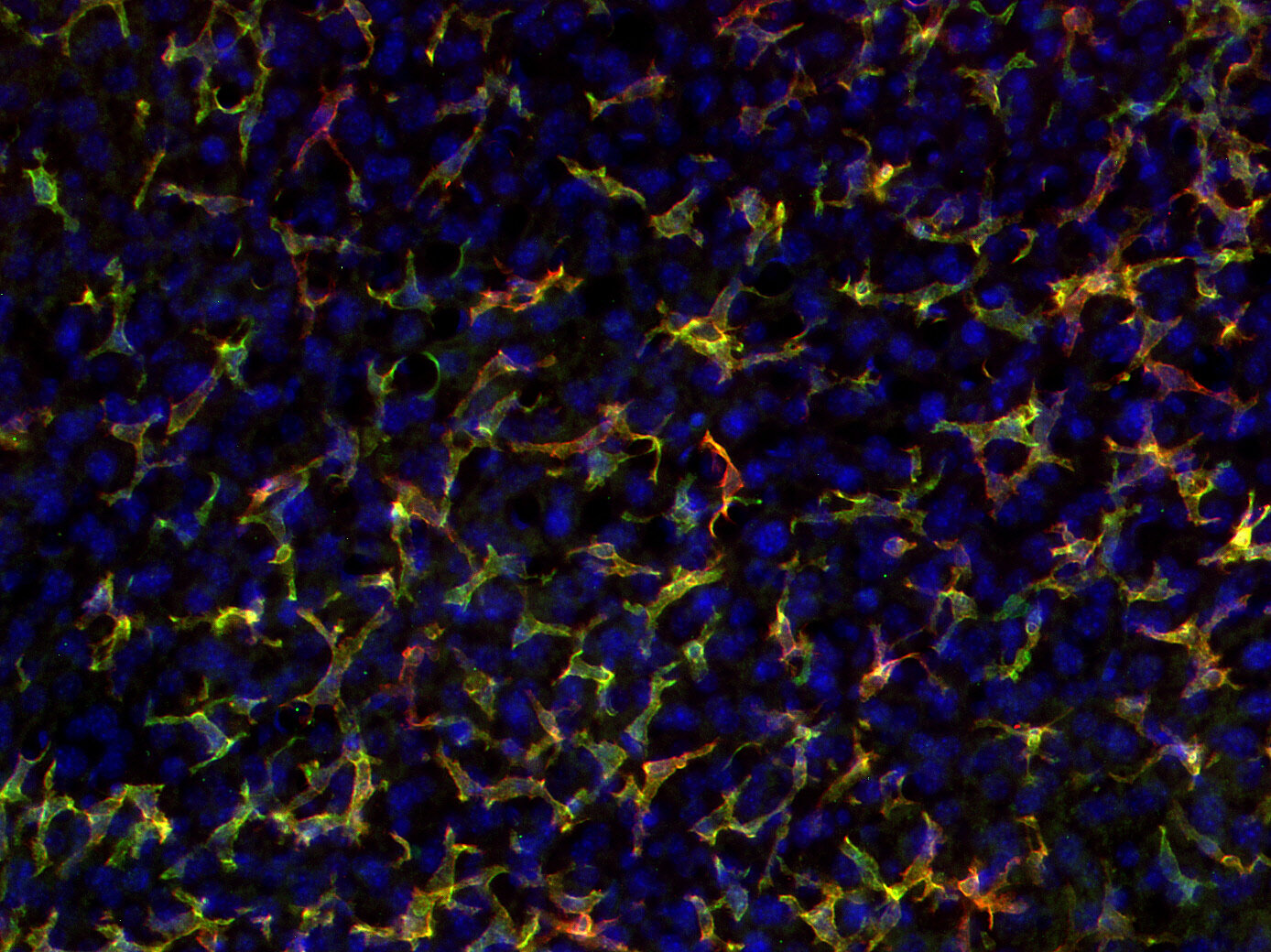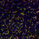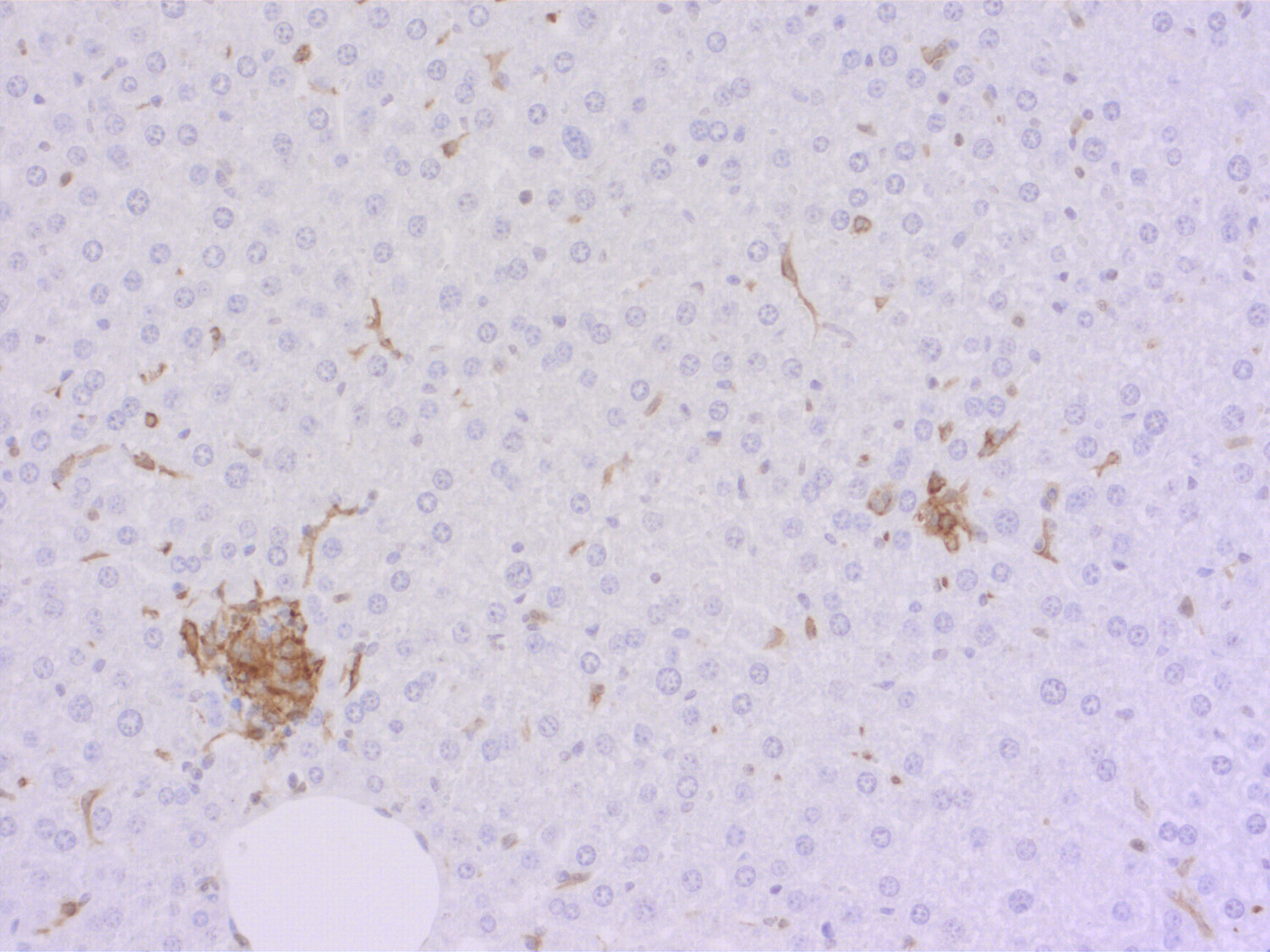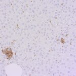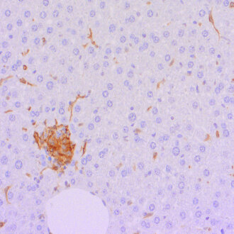 F4/80 positive Kupffer cells in FFPE mouse liver. Immunohistochemical staining of a formalin fixed paraffin embedded mouse liver tissue section with monoclonal rabbit anti-F4/80 (cat, no. HS-397 008, dilution 1:100, DAB). Nuclei have been counterstained with haematoxylin (blue).