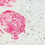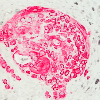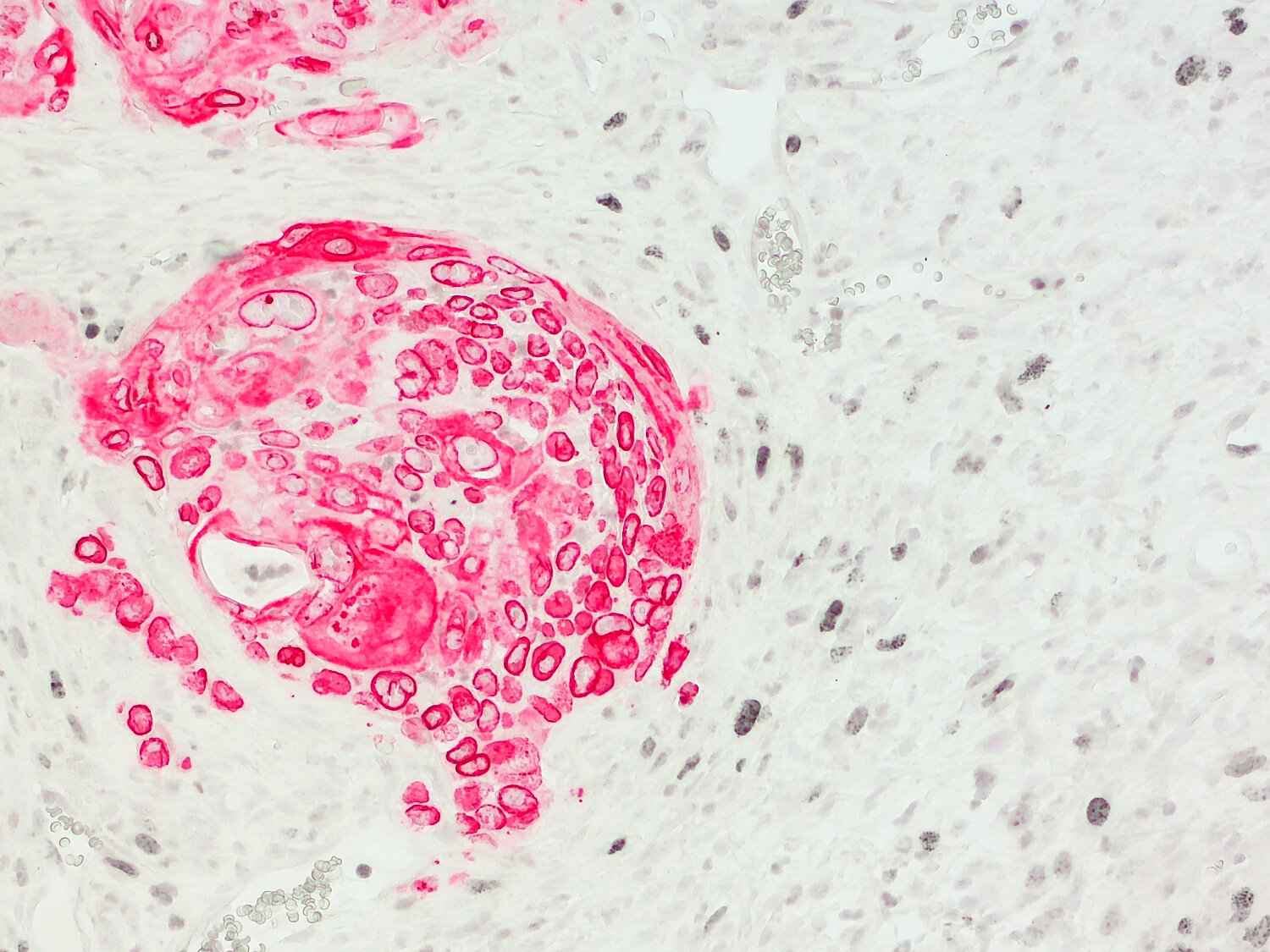 Red staining of Lamin B1 in human tumor cells in a xenograft model