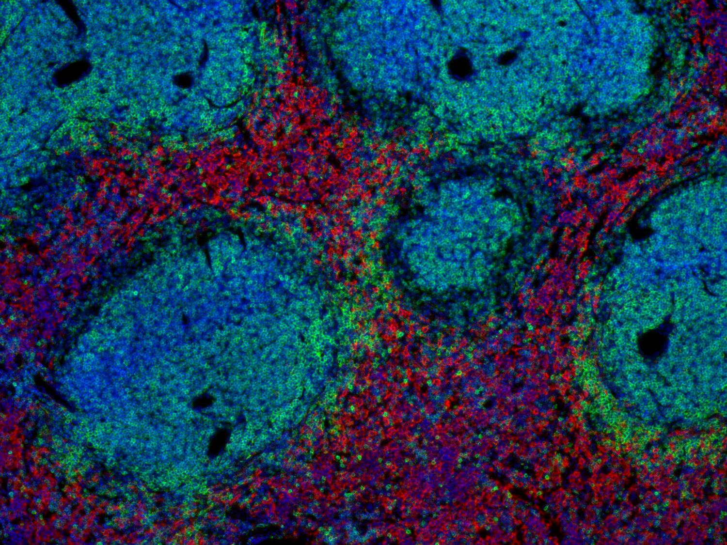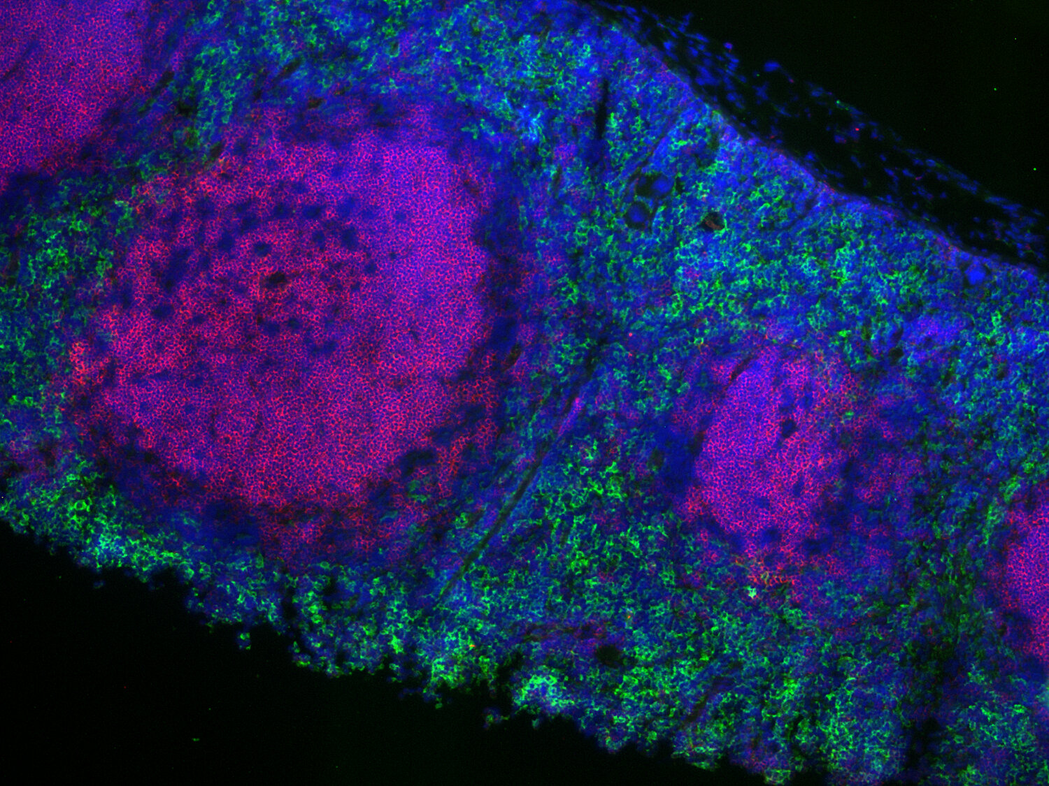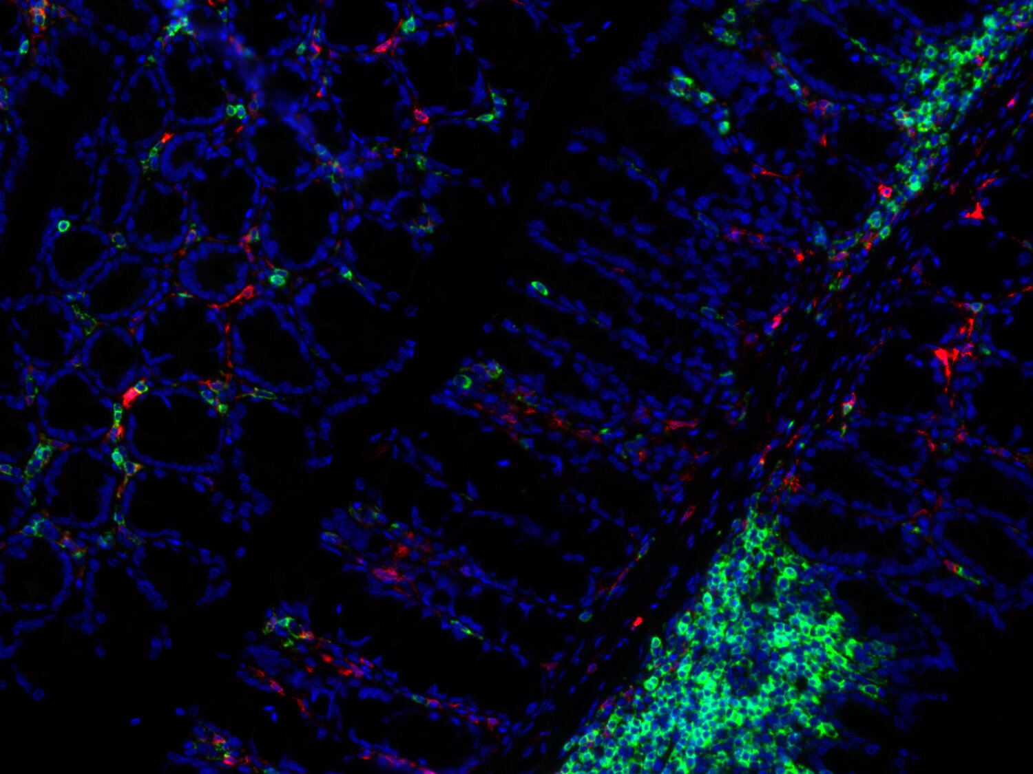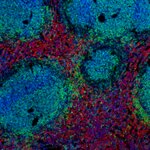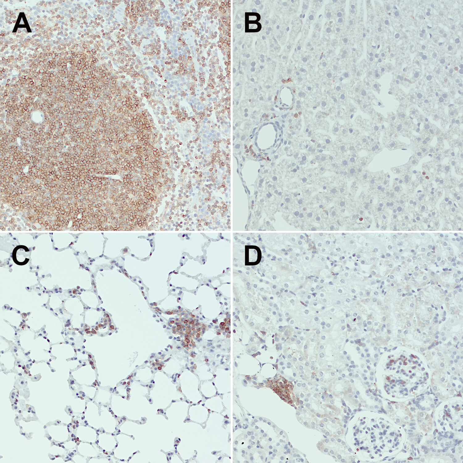 CD45, also designated as Leukocyte Common Antigen (LCA) or protein tyrosine phosphatase receptor type C (PTPRC), is a type I transmembrane protein expressed on all nucleated cells of the hematopoietic system, except mature erythrocytes and platelets (1). Several isoforms of CD45 have been identified which are generated by differential splicing of exons 4, 5, and 6, thereby generating the CD45RA, RB and RC isoforms, respectively (2). Expression of the isoforms differs according to cell type and functional status. The CD45RABC (B220) long isoform is almost exclusively expressed on B cells (3). Naïve human T cells express the high molecular weight isoform CD45RA. Activation of T cells and differentiation to memory T cells is accompanied by exon exclusion for production of the short isoform CD45RO (3). CD45 has been shown to be an essential regulator of T- and B-cell antigen receptor signaling. Thus, CD45-deficient humans and mice develop a severe-combined immunodeficiency (SCID) phenotype (4). In macrophages, CD45 plays a central role in their adhesion, morphology and motility (5).
