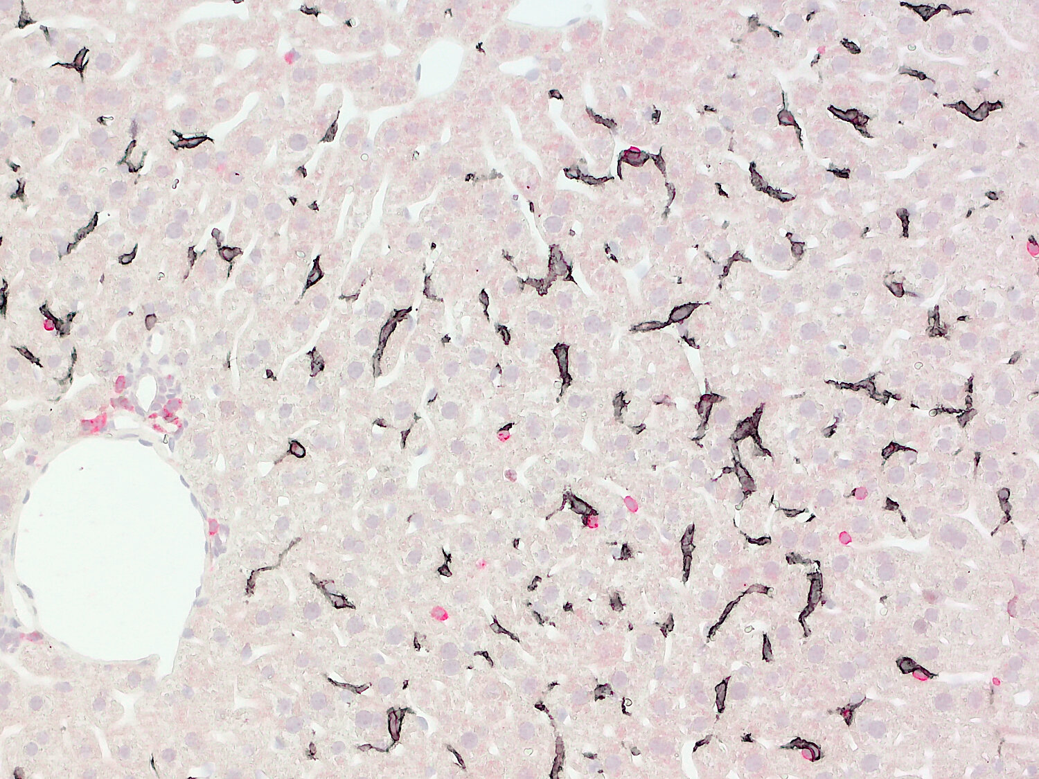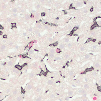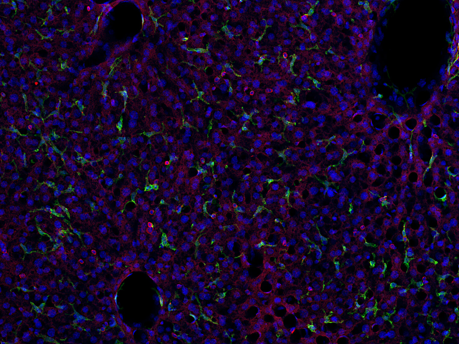 Detection of CD45+ (red) and F4/80+ (silver-grey) cells in mouse liver