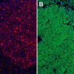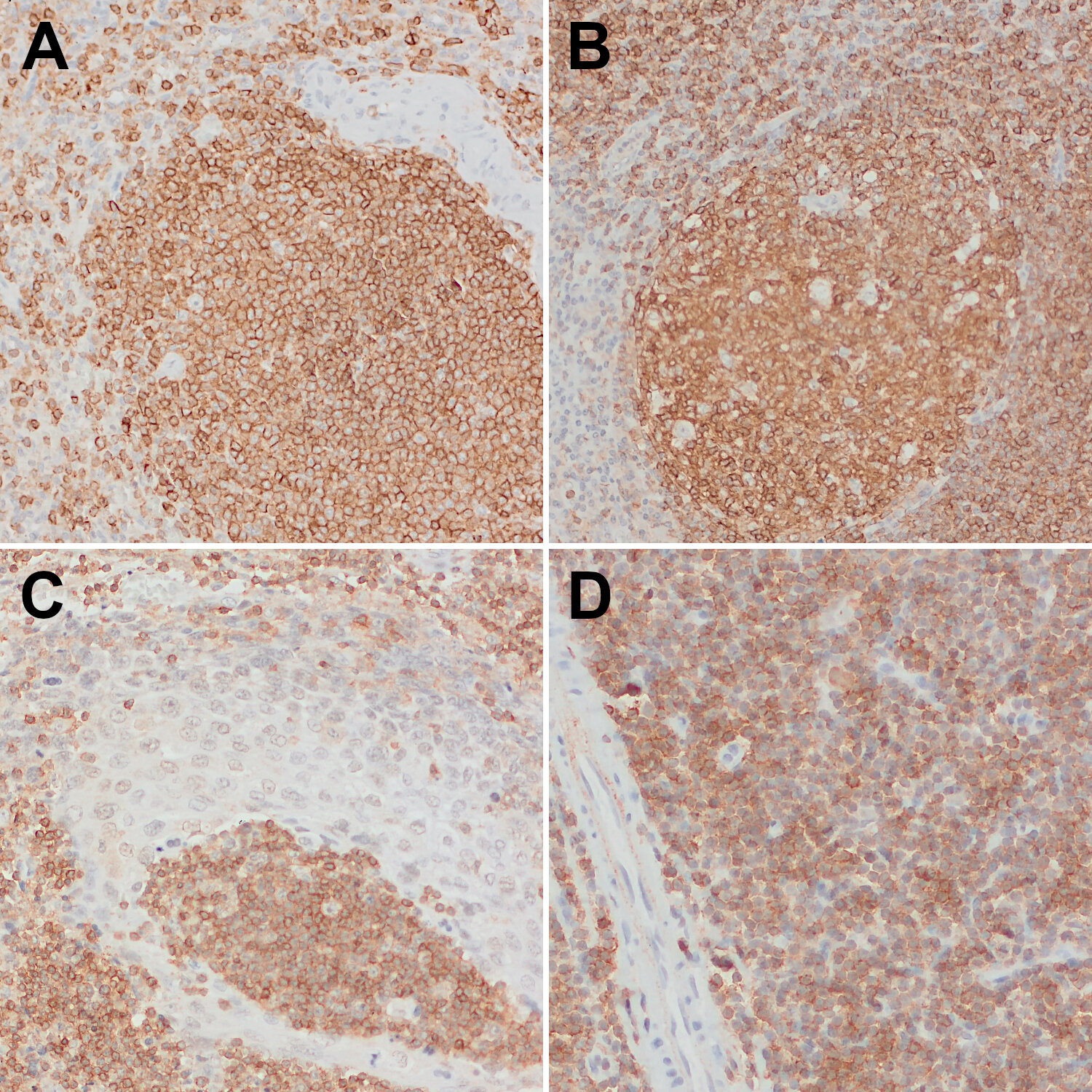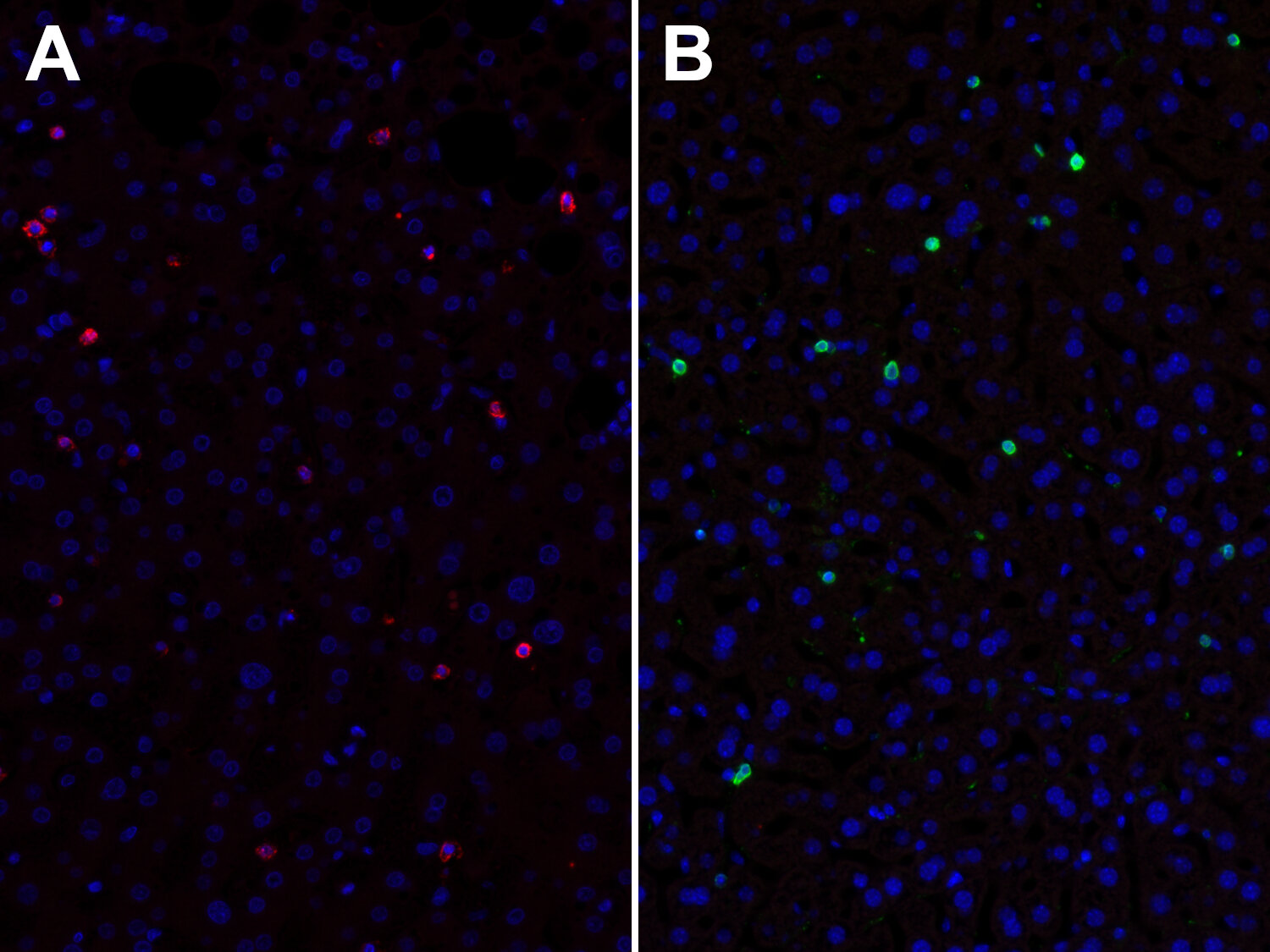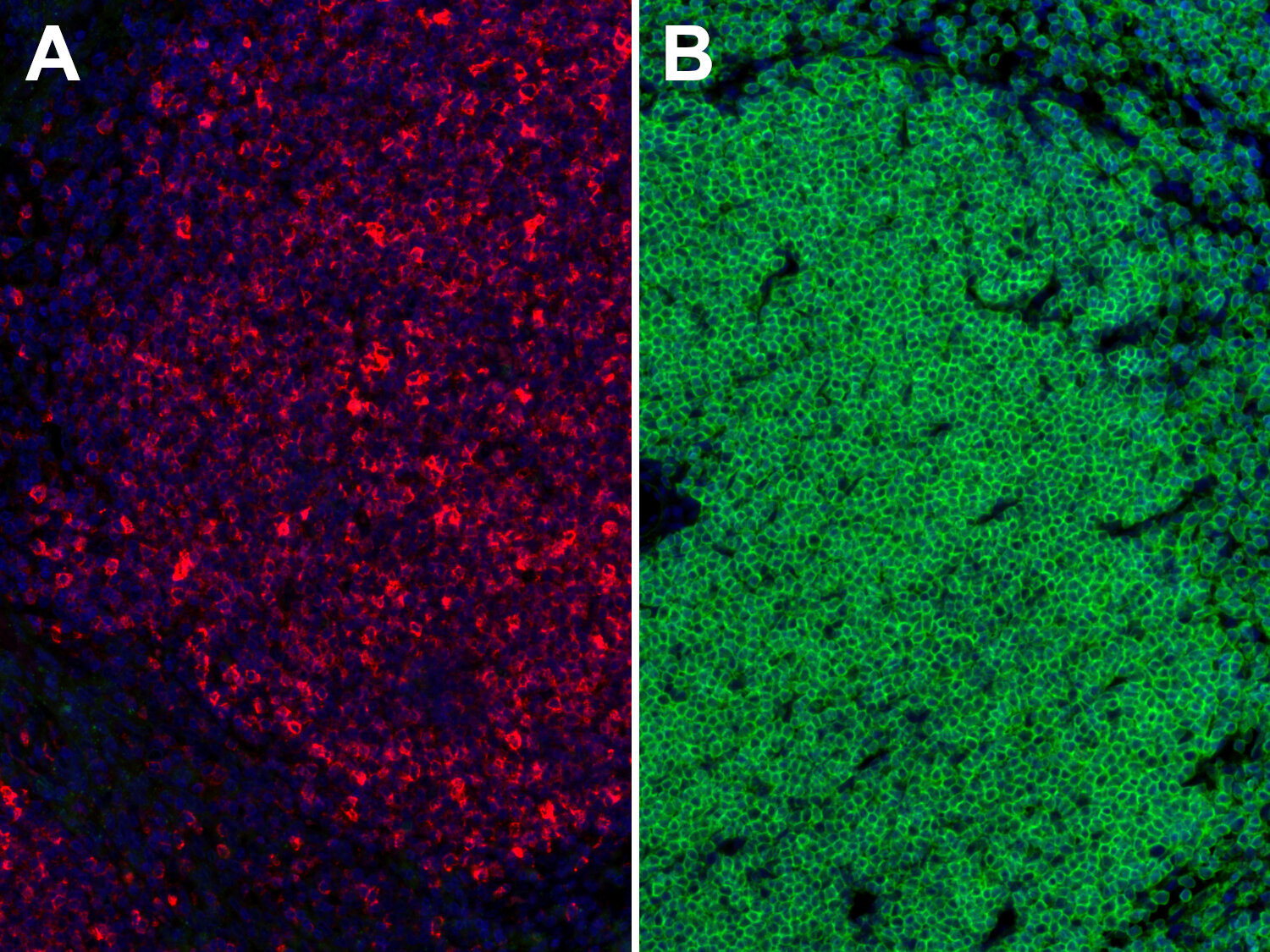 CD45, also designated as Leukocyte Common Antigen (LCA) or protein tyrosine phosphatase receptor type C (PTPRC), is a type I transmembrane protein expressed on all nucleated cells of the hematopoietic system, except mature erythrocytes and platelets (1). Several isoforms of CD45 have been identified which are generated by differential splicing of exons 4, 5, and 6, thereby generating the CD45RA, RB and RC isoforms, respectively (2). Expression of the isoforms differs according to cell type and functional status. The CD45RABC (B220) long isoform is almost exclusively expressed on B cells (3). Naïve human T cells express the high molecular weight isoform CD45RA. Activation of T cells and differentiation to memory T cells is accompanied by exon exclusion for production of the short isoform CD45RO (3). CD45 has been shown to be an essential regulator of T- and B-cell antigen receptor signaling. Thus, CD45-deficient humans and mice develop a severe-combined immunodeficiency (SCID) phenotype (4). In macrophages, CD45 plays a central role in their adhesion, morphology and motility (5).
