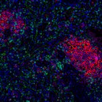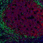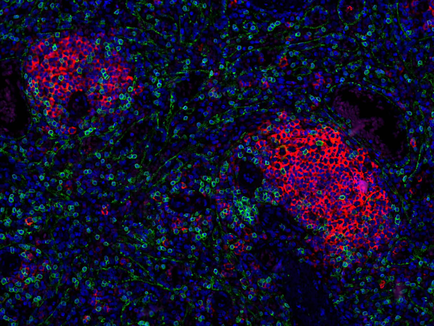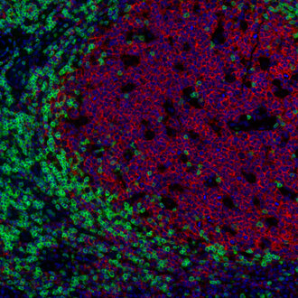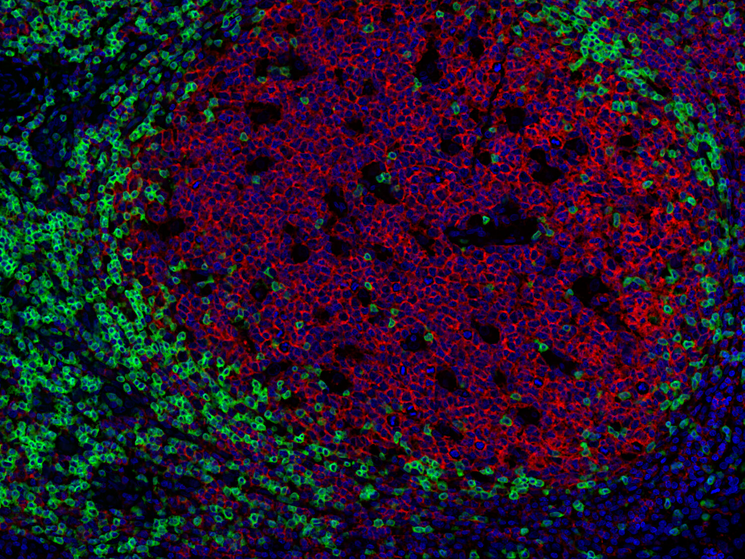Immunofluorescence image of a human FFPE tonsil section stained for CD19 (B cells, red) and CD3e (T cells, green)