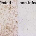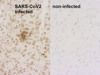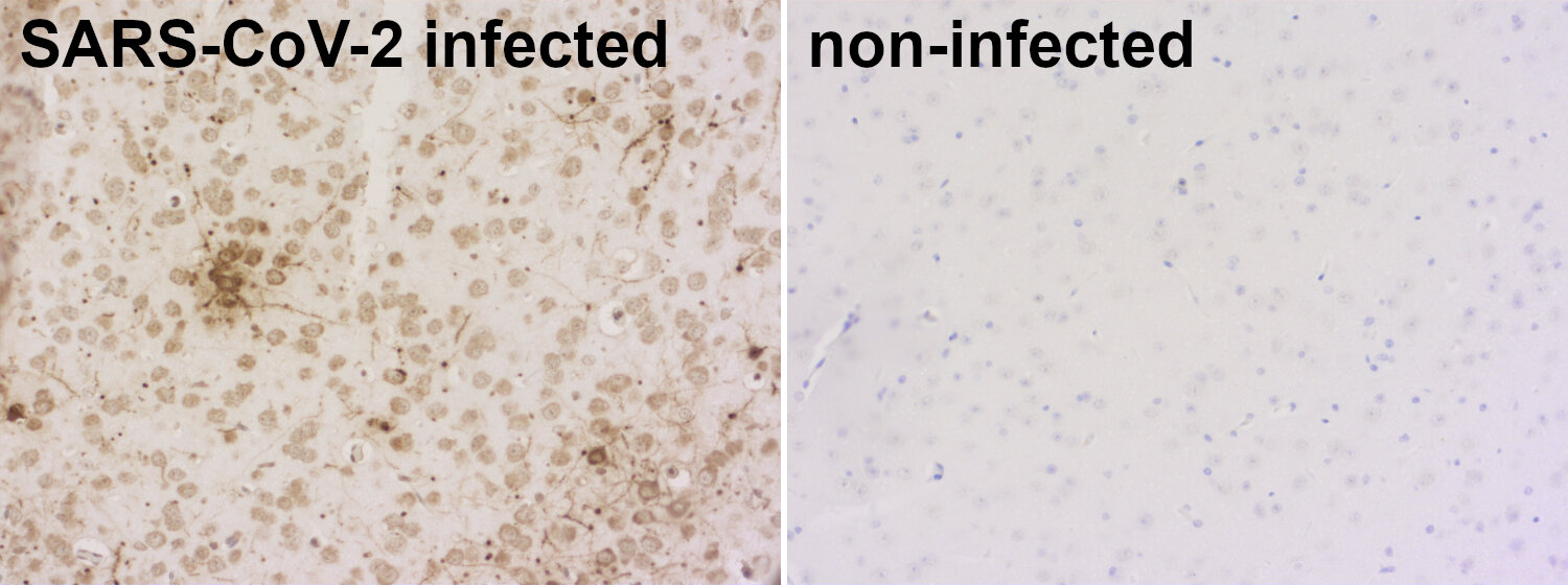 Detection of SARS-CoV-2 nucleocapsid protein in brains of SARS-CoV-2 infected and non-infected K18-hACE2 transgenic mice.