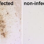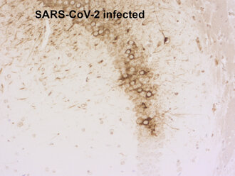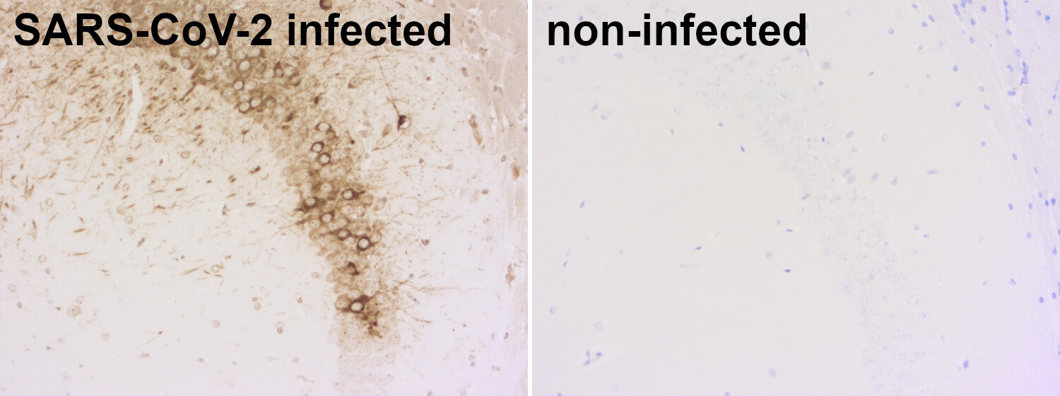 Detection of SARS-CoV-2 nucleocapsid protein in the brain of a SARS-CoV-2 infected K18-hACE2 transgenic mouse.