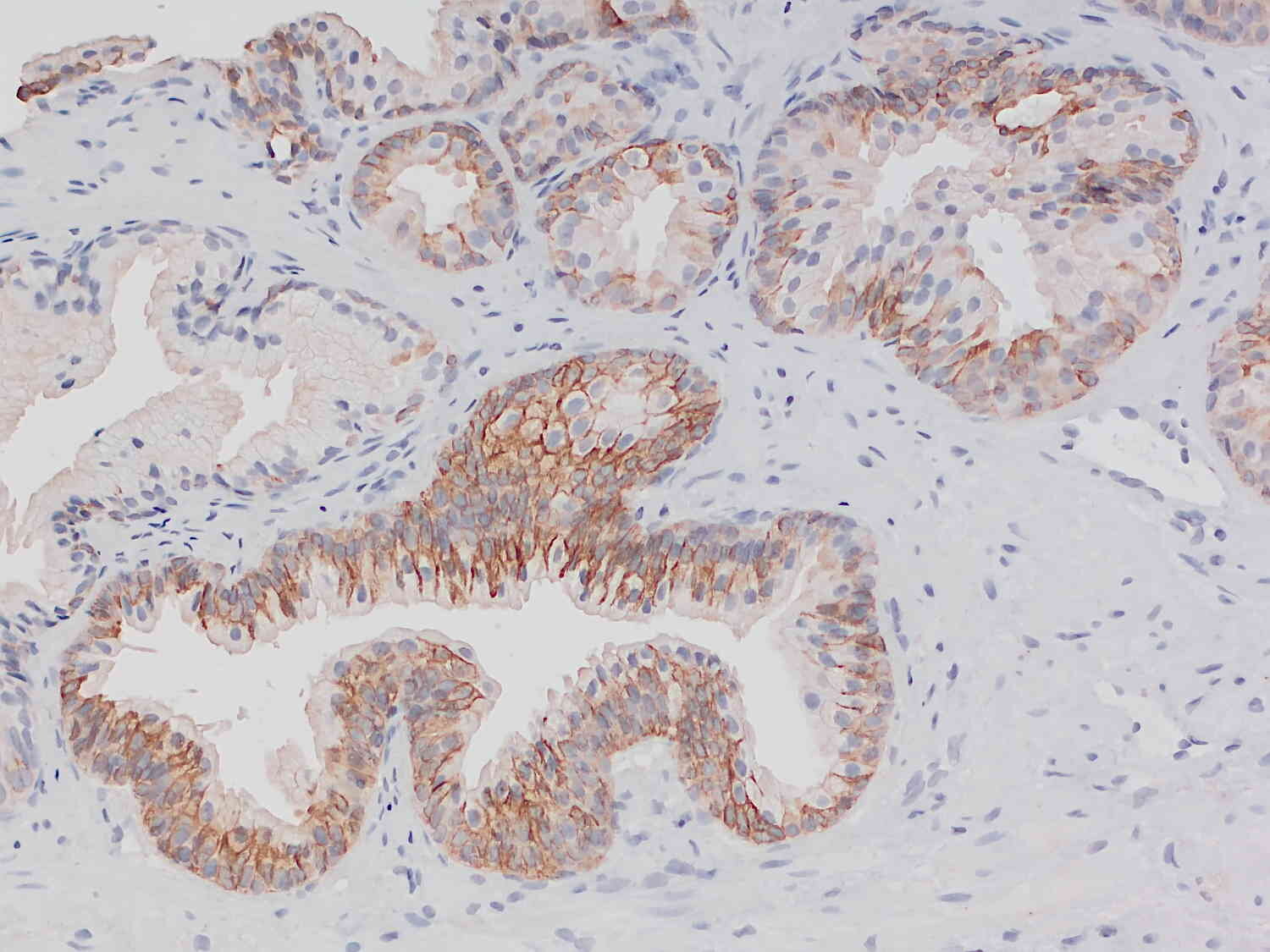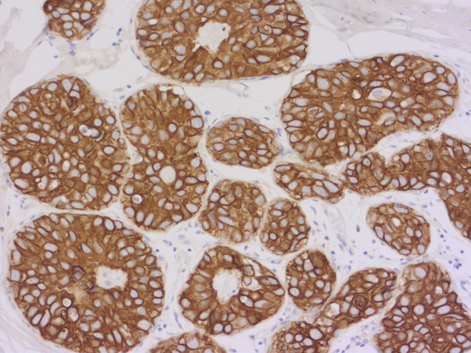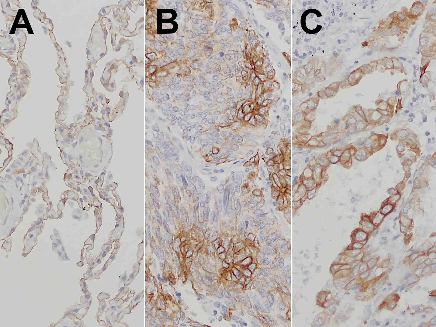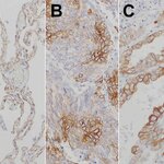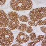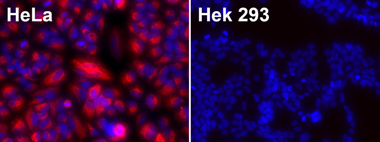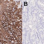 Cytokeratins are cytoskeleton proteins of epithelial tissues, contributing to the mechanical stabilization of the cells. The cytokeratin family consists of at least 20 isotypes, which are largely specific for particular organs or tissue types. Therefore, immunohistochemical staining of cytokeratins is clinically used for diagnosis of carcinomas, in particular of unclear metastases and in precise classification and subtyping of tumors (1). Cytokeratin 7 (CK7) is expressed in healthy bladder, in the female genital tract epithelium, in mesothelium and in the lung (2). In tumors, CK7 expression is found in the majority of carcinoma types, with the exception of those carcinomas arising from the colon, prostate, kidney and thymus (3). Furthermore, CK7 expression can have prognostic relevance, e.g. adverse prognostic factor in lung cancer (4), or predictive relevance, e.g. predictive factor of response to concurrent radiochemotherapy in advanced cervical cancer (5).