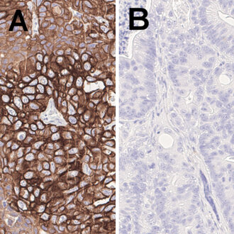 Cytokeratin 7 staining in a human CK7-positive pancreatic adenocarcinoma (A) and a human CK7-negative colon carcinoma xenograft (B)