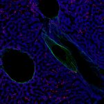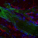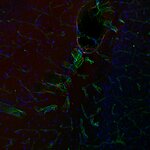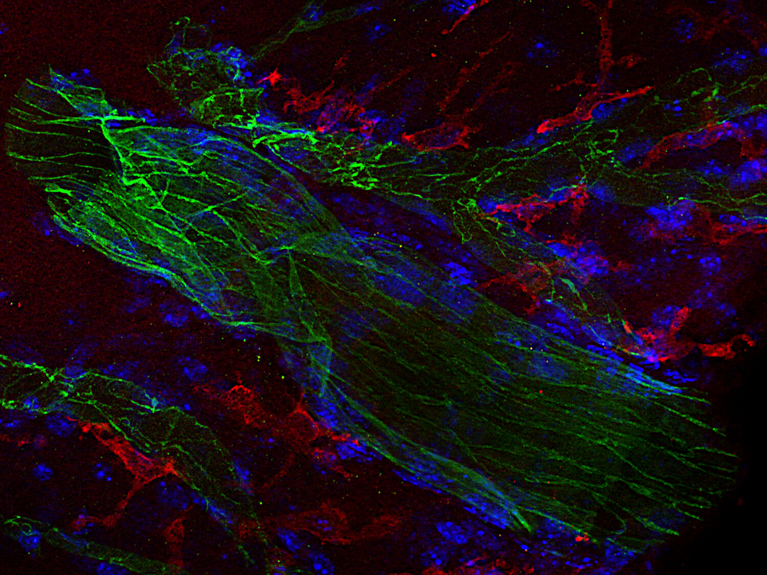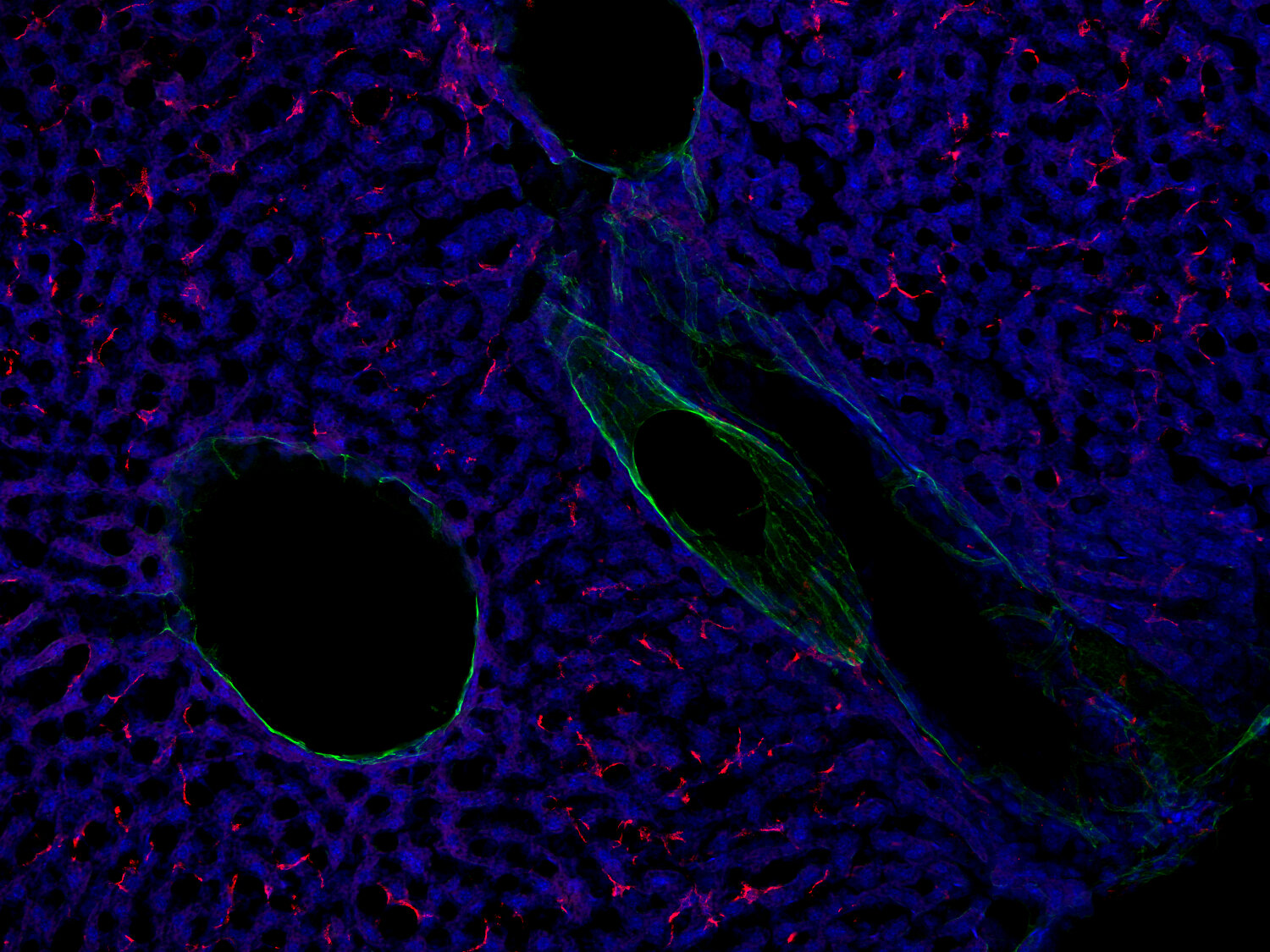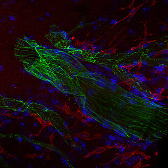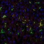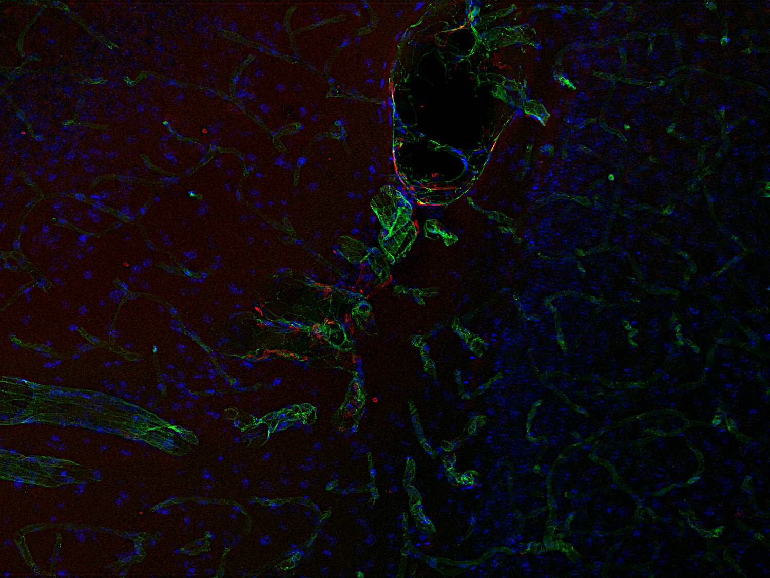 Immunohistochemical staining of mouse brain using anti-CD163 (red) and anti-CD31 (green) highlights the border-associated macrophages (BAMs)