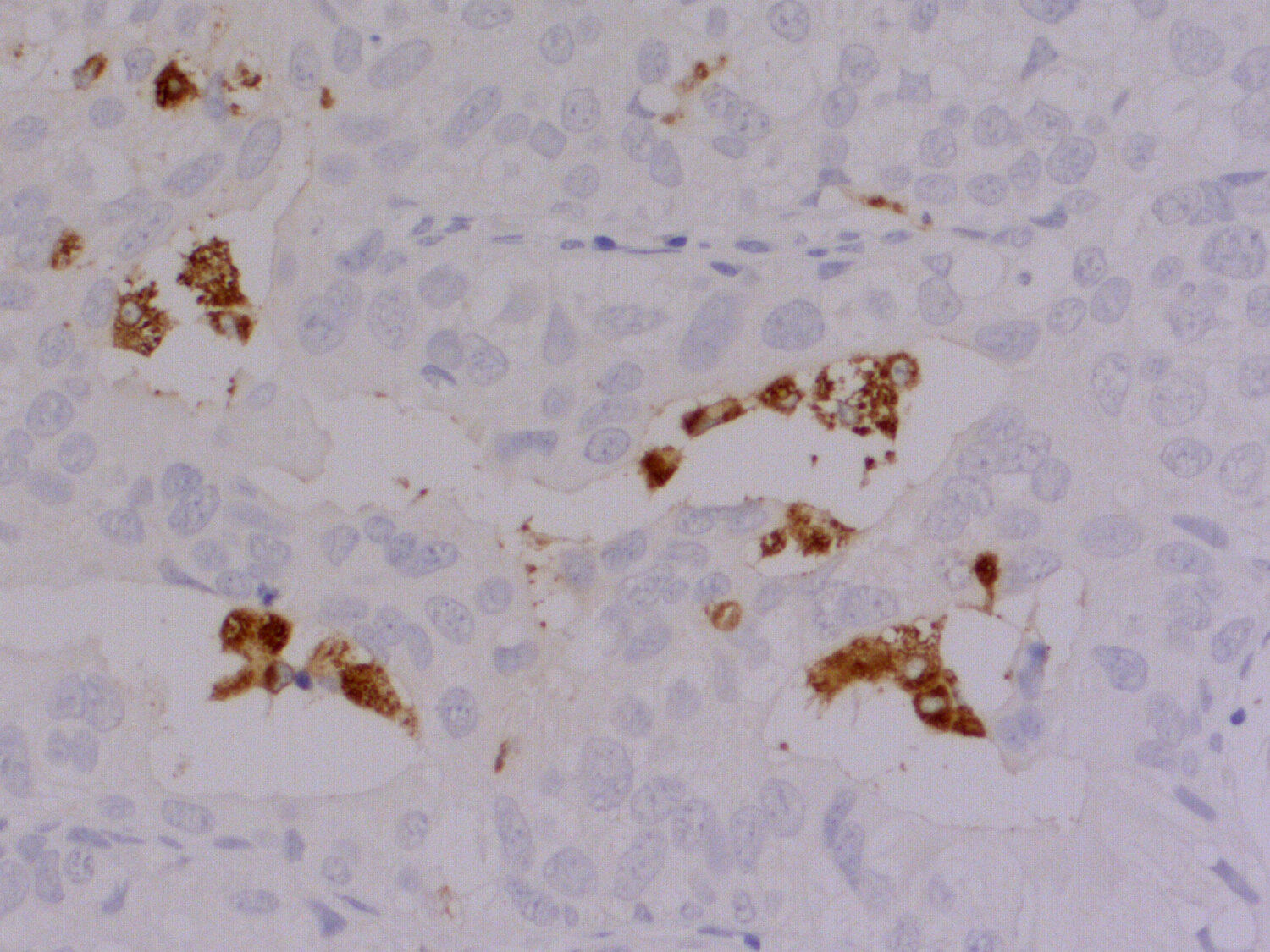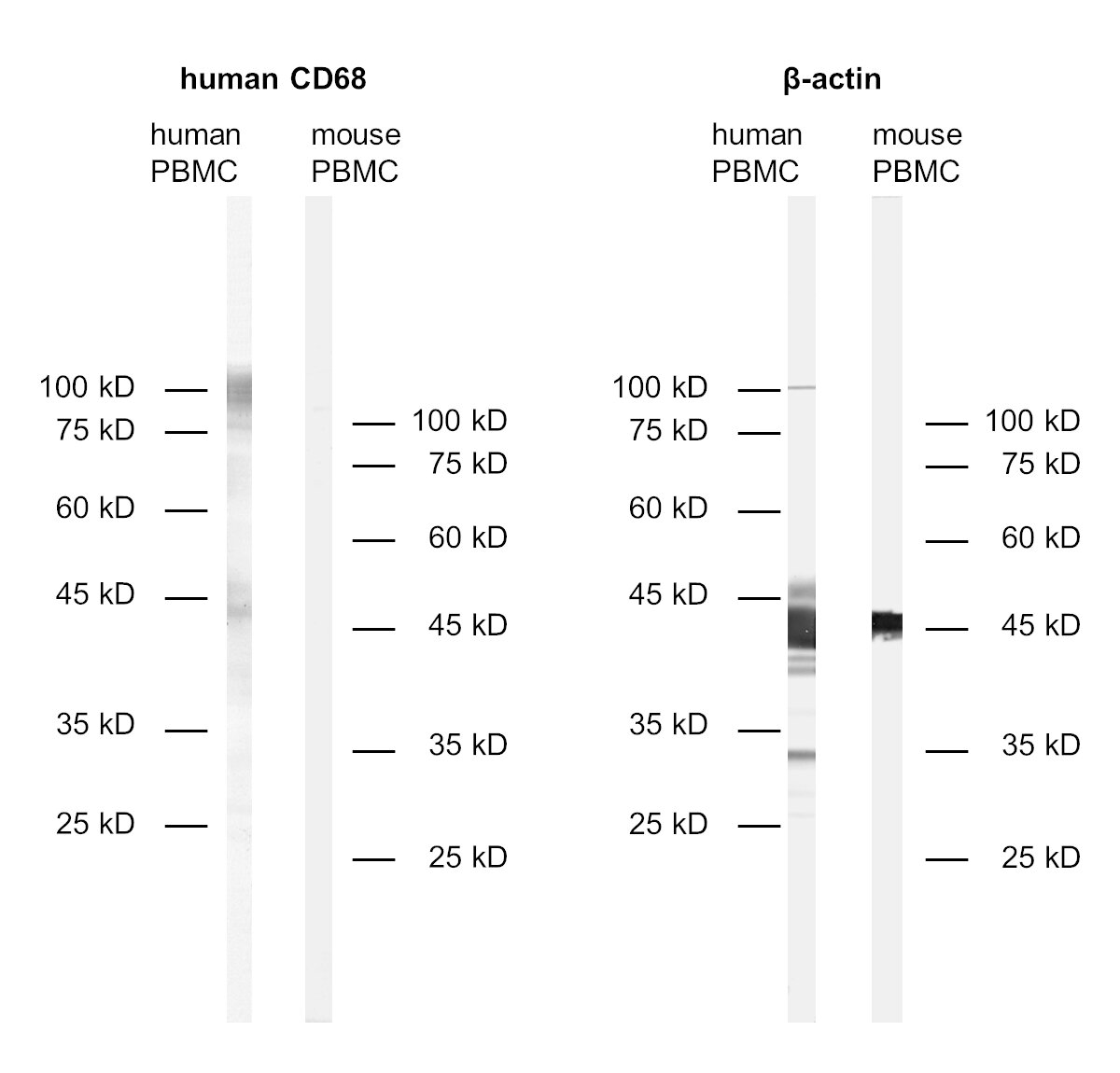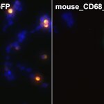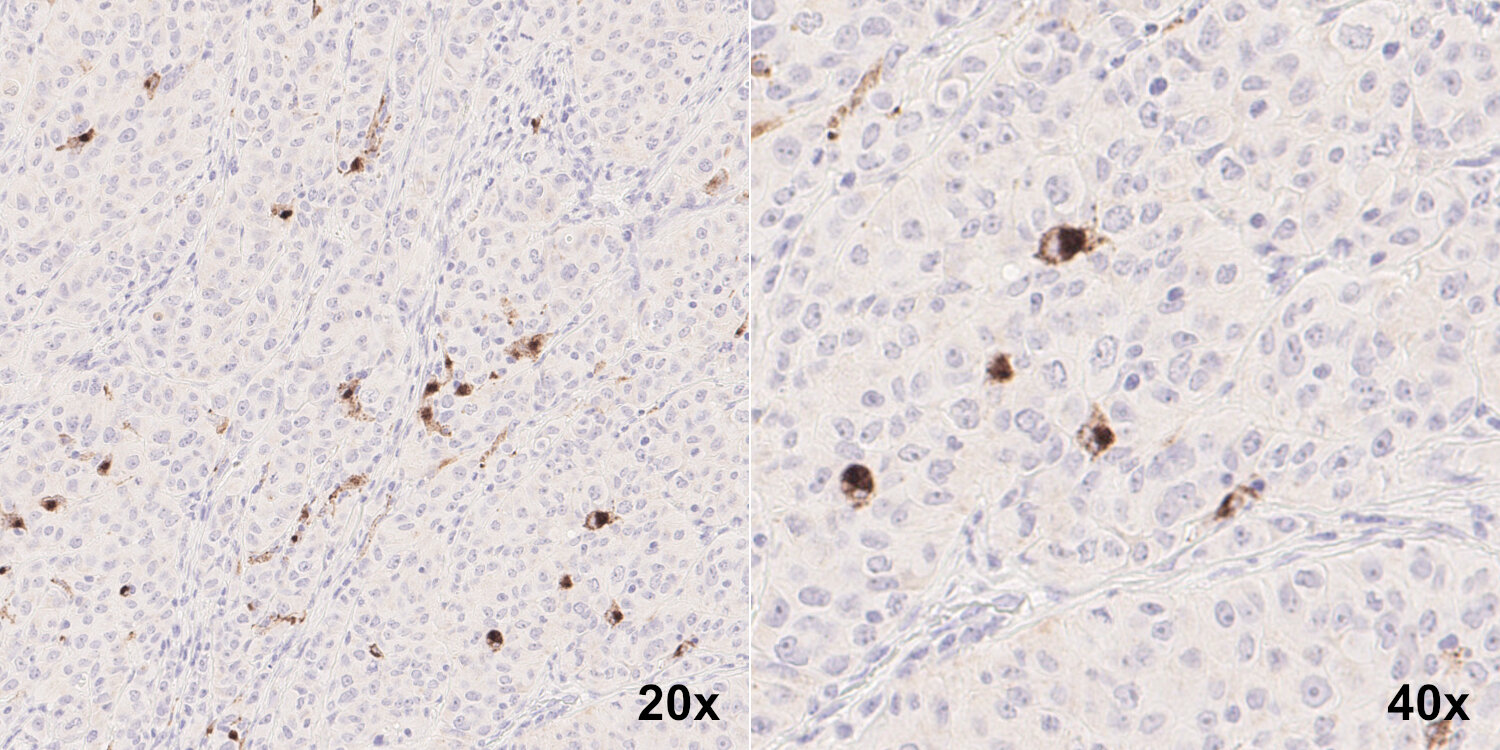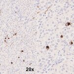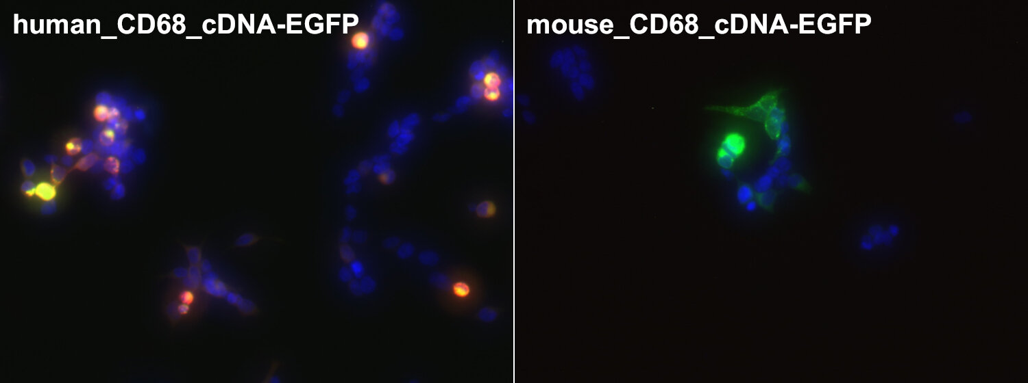 CD68, also called Lamp-4 in humans or macrosialin in mice, is a highly glycosylated type I transmembrane protein that belongs to the lysosome associated membrane protein (LAMP) family (1). CD68 expression is increased in cells associated with elevated phagocytic and degradative activity. High CD68 expression is detected in cells of the mononuclear phagocyte lineage including macrophages, osteoclasts, and myeloid dendritic cells (2). CD68 is a marker of activated microglia and only expressed at low levels in resting microglia (3). Staining for CD68 is predominantly intracellular, only 10 -15% of it is found on the cell surface. In oncology research, CD68 is the major biomarker for quantification of tumor-associated macrophages (TAMs) (4). High infiltration of CD68+ macrophages is an independent prognostic factor for overall survival in several tumor entities (5).