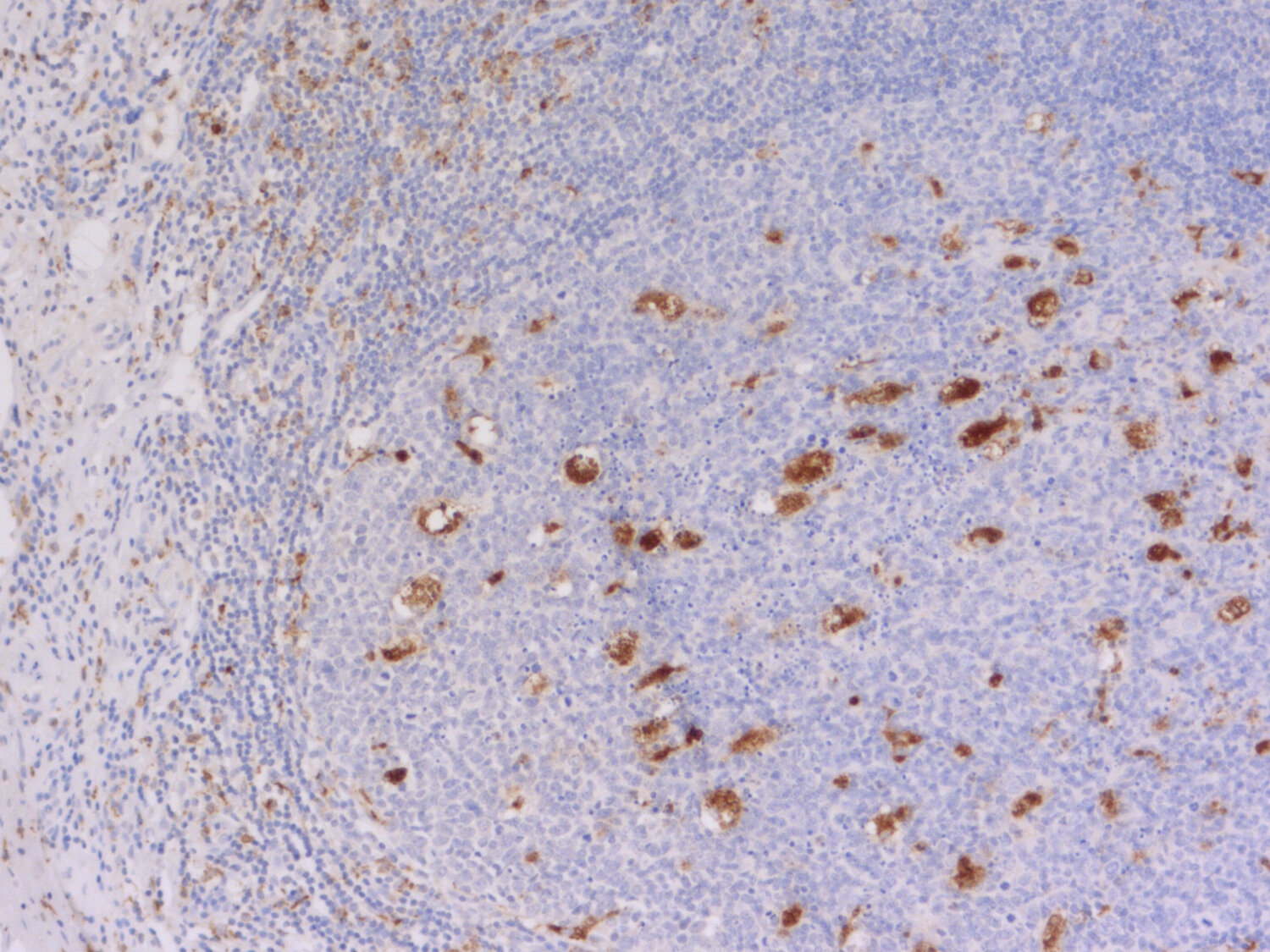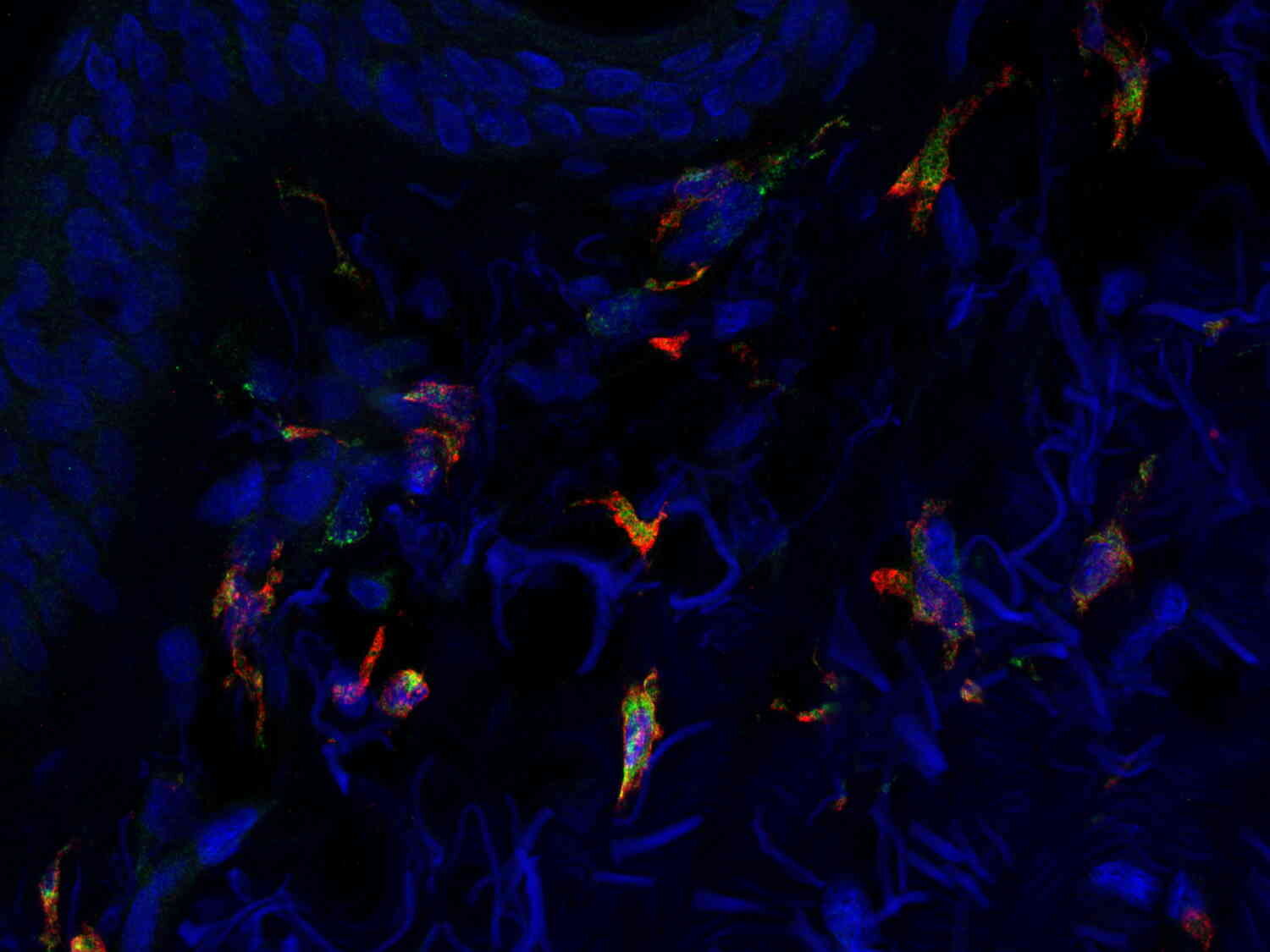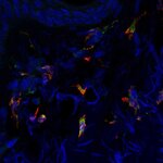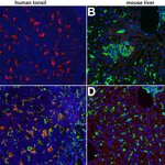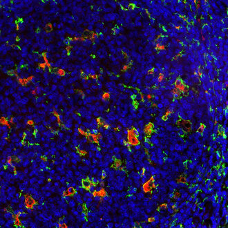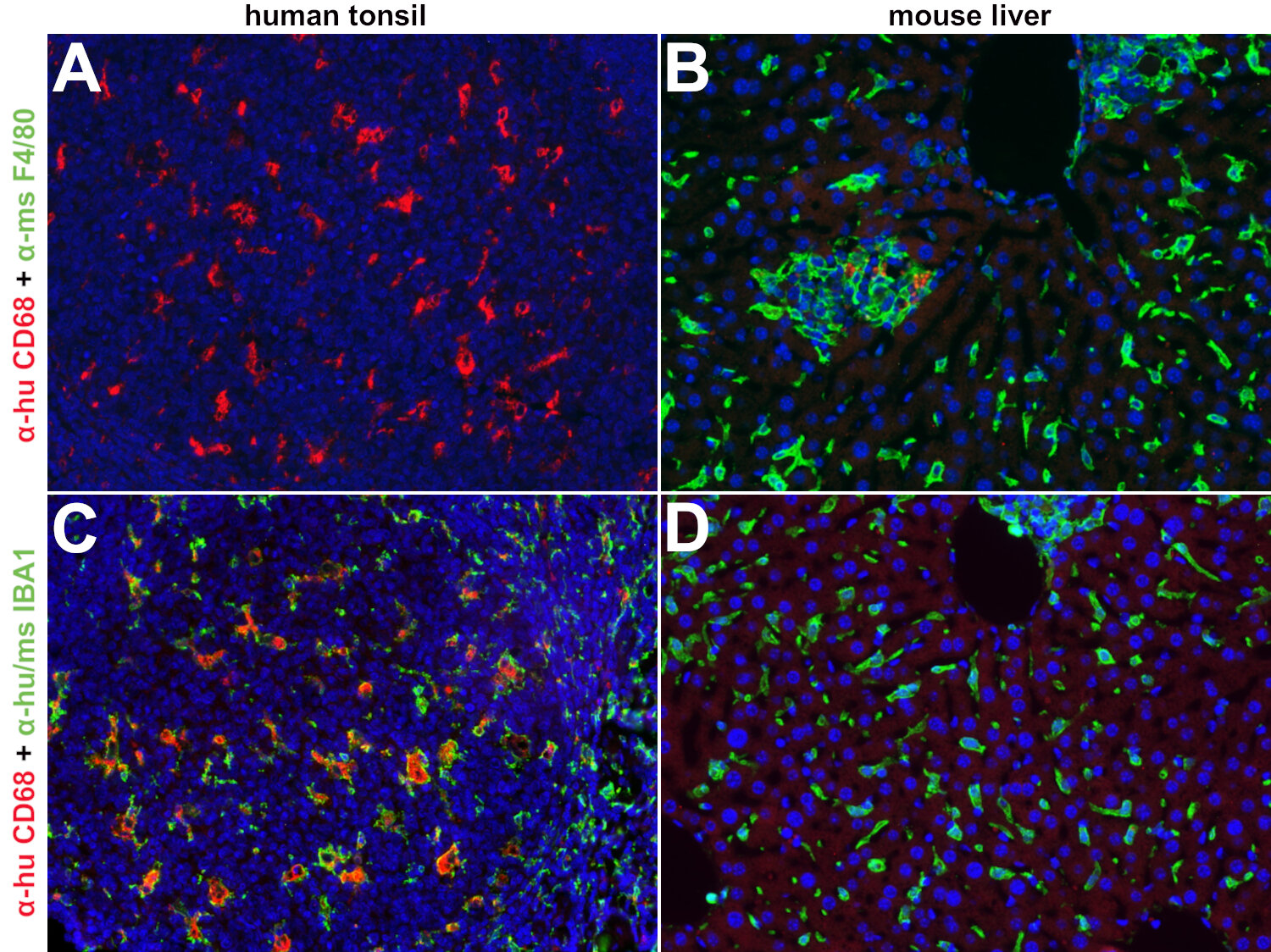 Indirect immunostaining of human tonsil section with rat anti-CD68 (red) and rabbit anti-IBA1 (green).