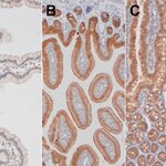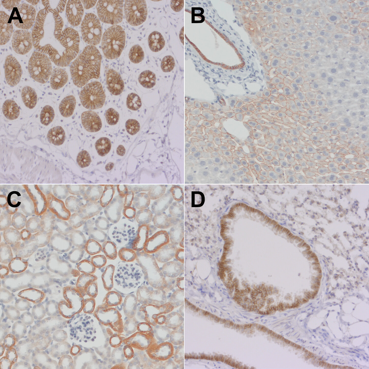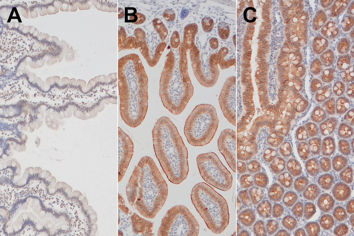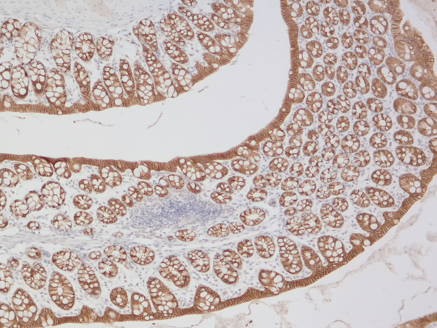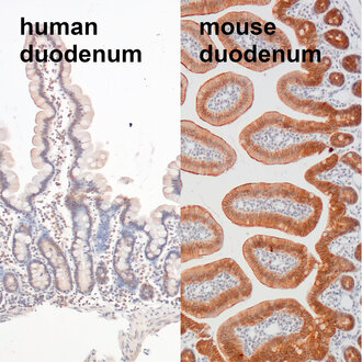 Indirect immunostaining of human and mouse duodenum sections using mouse-E-cadherin specific antibody.