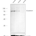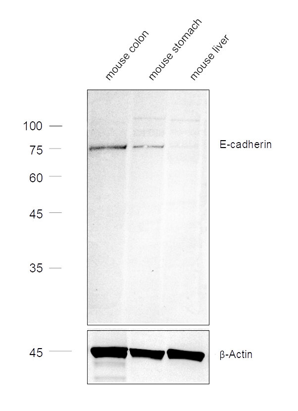Epithelial cadherin (E-cadherin) also known as Cadherin-1, CAM 120/80 or uvomorulin belongs together with neuronal (N) cadherin to the type I classical cadherins, transmembrane proteins that function in calcium-dependent cell-cell adhesion (1). In normal tissues, E-cadherin is expressed by most epithelial cells. A distinct distribution of E-cadherin expression is found in the kidney, where only distal tubuli show E-cadherin expression and in the placenta, where only the cytotrophoblastic layer stains positive for E-cadherin (2). In the human normal adult nervous system E-cadherin expression is limited to the arachnoid membrane, whereas in mice E-cadherin is also expressed in neural stem cells, where E-cadherin regulates self-renewal (3). E-cadherin is a potent tumor suppressor and the so-called “cadherin switch” - downregulation of E-cadherin while N-cadherin is upregulated - is often found in malignant epithelial cancers. This Epithelial-to-Mesenchymal Transition (EMT) has been shown to be crucial in tumorigenesis where the EMT program enhances metastasis, chemoresistance and tumor stemness (4). However, also E-cadherin upregulation in malignancies derived from E-cadherin negative normal tissues tend to be linked to unfavorable tumor phenotype and disease outcome (2). In syngeneic mouse tumors E-cadherin expression is typically lower than in human tumors suggesting that syngeneic mouse models have a more mesenchymal-like tumor cellular phenotype (5).