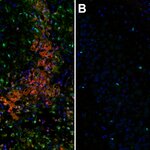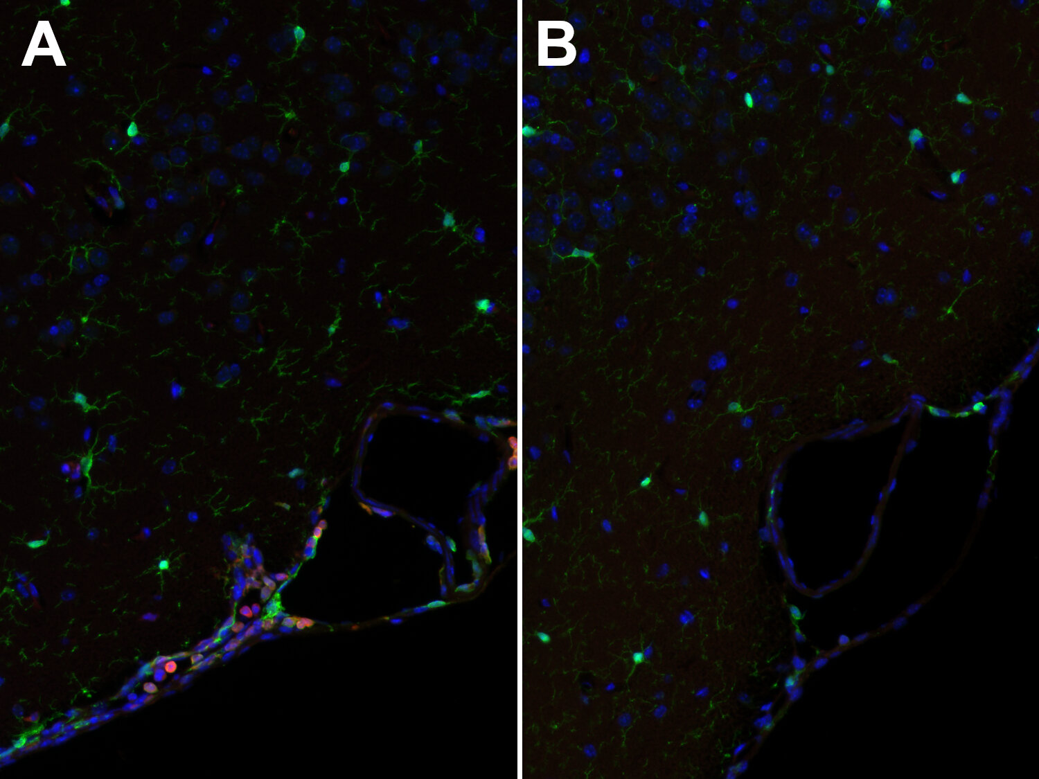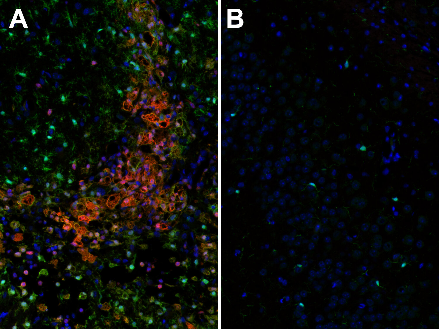 Co-expression of Galectin-3 (red) and IBA1 (green) in a subset of activated microglia