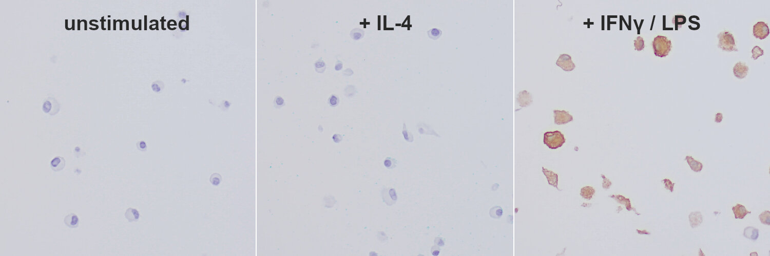 Inducible nitric oxide synthase (iNOS) belongs together with endothelial NOS (eNOS) and neuronal NOS (nNOS) to the NOS family of enzymes catalyzing the production of nitric oxide (NO) from L-arginine. In contrast to the constitutively expressed calcium-dependent eNOS and nNOS isoforms, iNOS is calcium-independent and usually activated in defense responses such as infection and inflammation (1). Expression of the iNOS gene is induced in vitro in macrophages polarized to the pro-inflammatory M1 state (2). NO-producing tumoricidal macrophages in the tumor microenvironment can modulate immune responses and promote apoptosis of tumor cells (2). In the brain, iNOS is normally not expressed except in chronic and acute inflammatory conditions. In ischemic brain injury, iNOS was found to be highly expressed in neutrophils and endothelium (3) and in M1-like pro-inflammatory microglia (4).