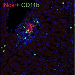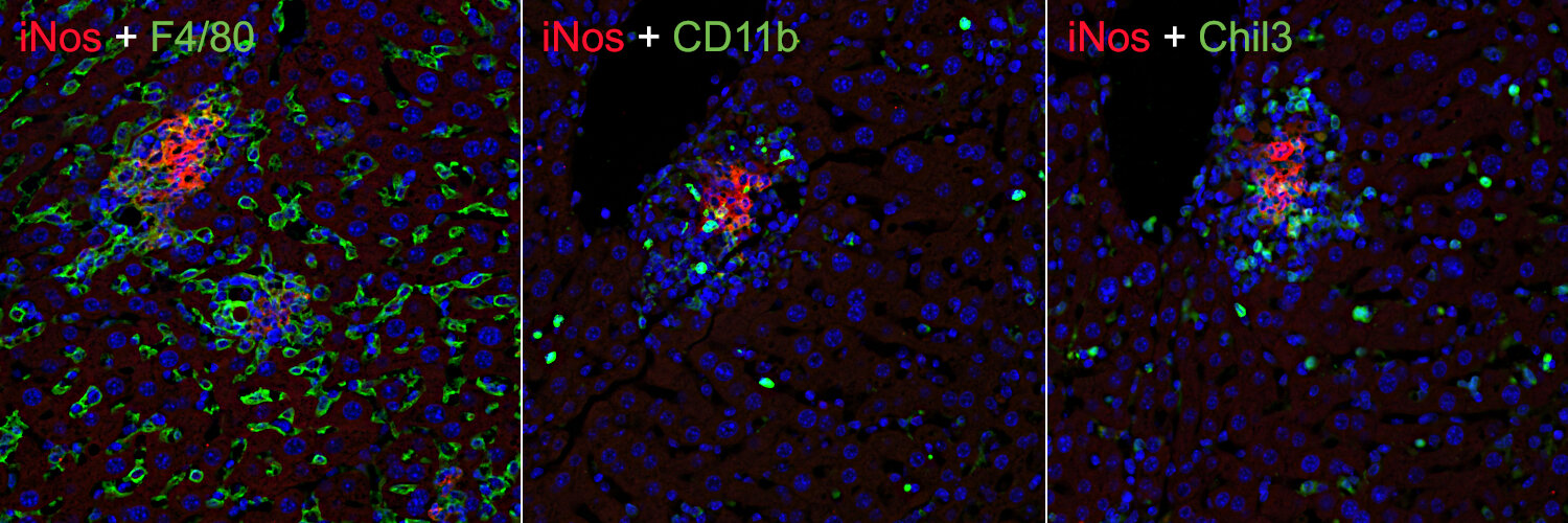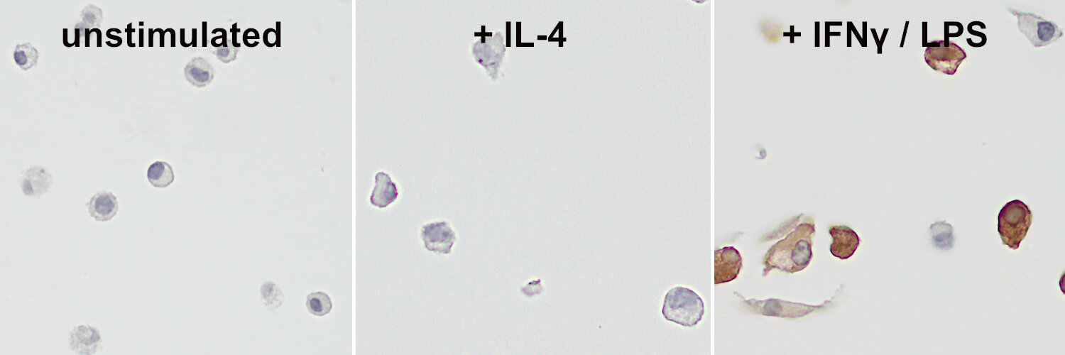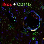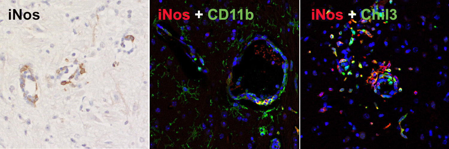 Inducible nitric oxide synthase (iNOS) belongs together with endothelial NOS (eNOS) and neuronal NOS (nNOS) to the NOS family of enzymes catalyzing the production of nitric oxide (NO) from L-arginine. In contrast to the constitutively expressed calcium-dependent eNOS and nNOS isoforms, iNOS is calcium-independent and usually activated in defense responses such as infection and inflammation (1). Expression of the iNOS gene is induced in vitro in macrophages polarized to the pro-inflammatory M1 state (2). NO-producing tumoricidal macrophages in the tumor microenvironment can modulate immune responses and promote apoptosis of tumor cells (2). In the brain, iNOS is normally not expressed except in chronic and acute inflammatory conditions. In ischemic brain injury, iNOS was found to be highly expressed in neutrophils and endothelium (3) and in M1-like pro-inflammatory microglia (4).