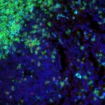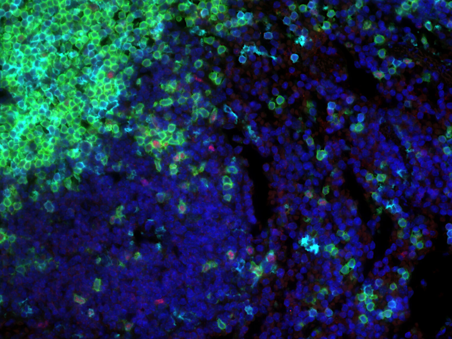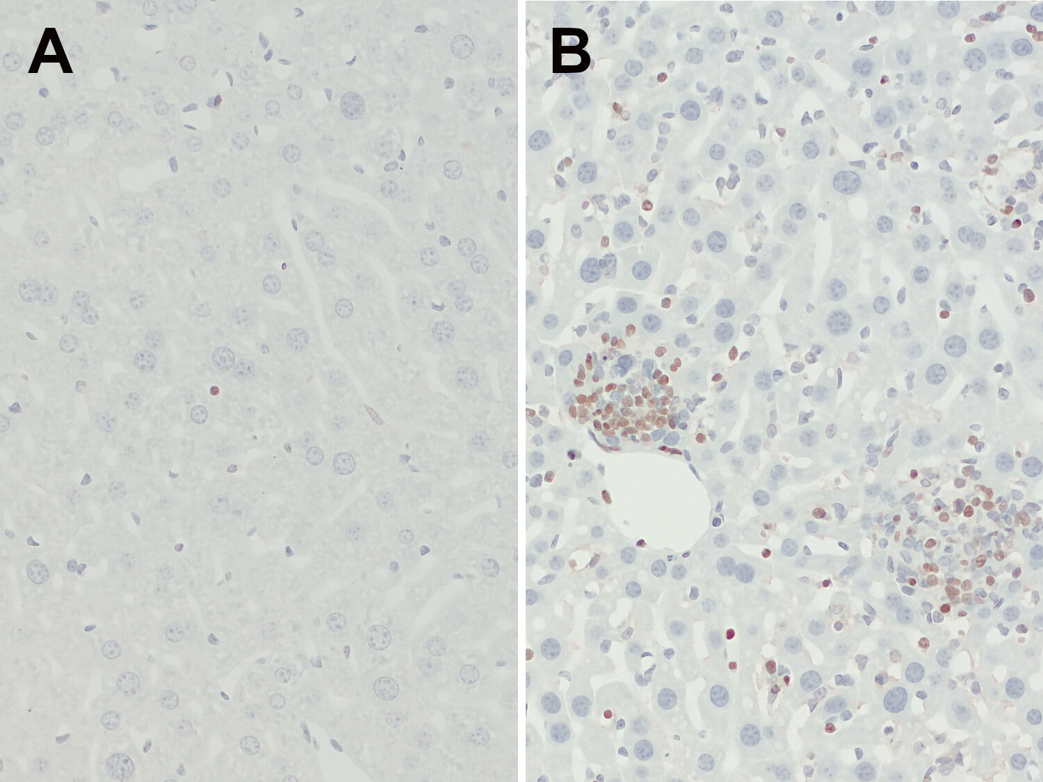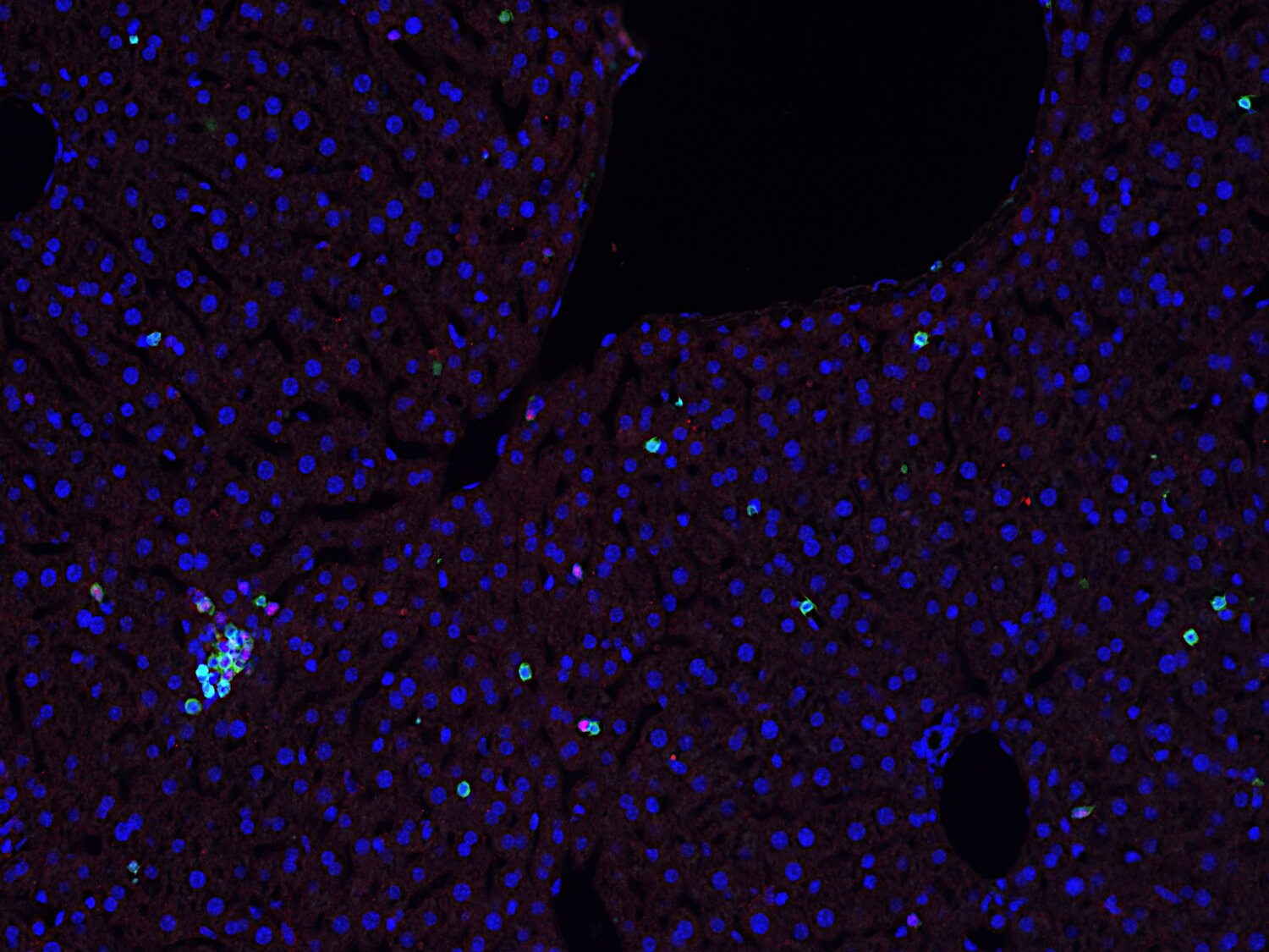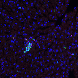 Nuclear T-bet expression (red) is detected in CD4-positive T cells (green) but not in CD8-positive T cells (turquoise) in a mouse liver section