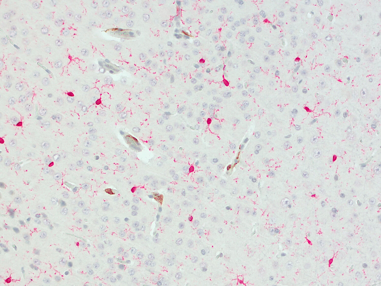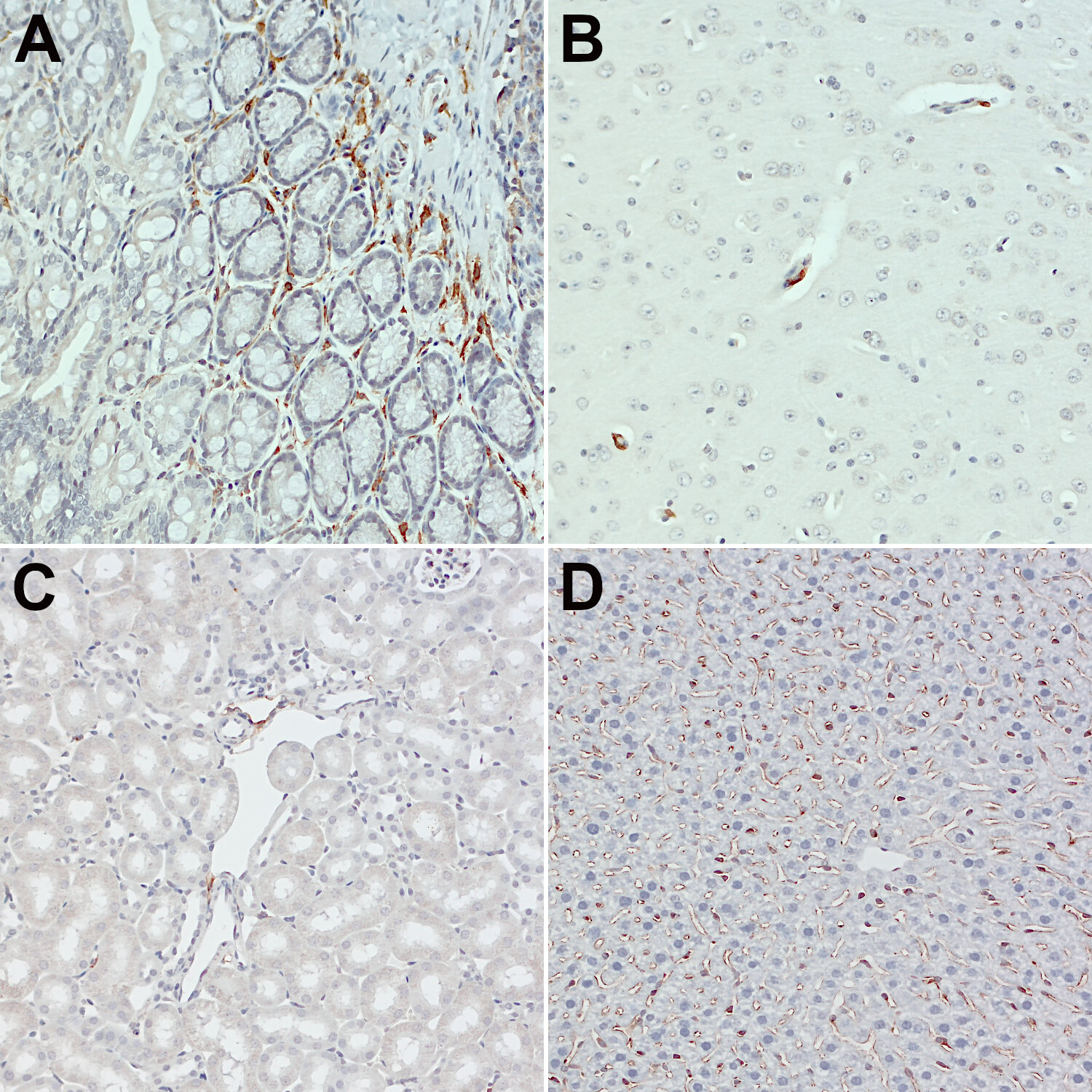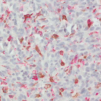 CD206, also known as macrophage mannose receptor type C (MMR or MRC1), is a member of the C-type lectin (CLEC) family. CD206 is expressed by subpopulations of macrophages, immature dendritic cells, and liver sinusoidal endothelial cells. Its expression level is differentially regulated by cytokines (e.g., IL-10, IL-4, IL-13, and IFNγ), prostaglandins, LPS, and the transcription factor PPAR-γ (1). CD206 functions in endocytosis and phagocytosis (1) and high expression is found both on pro- and antitumor TAMs (tumor-associated macrophages) (2). In the brain, border-associated macrophages (BAMs) can be discriminated from microglia by the expression of CD206 and CD169 (3).