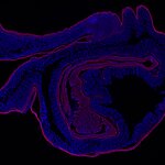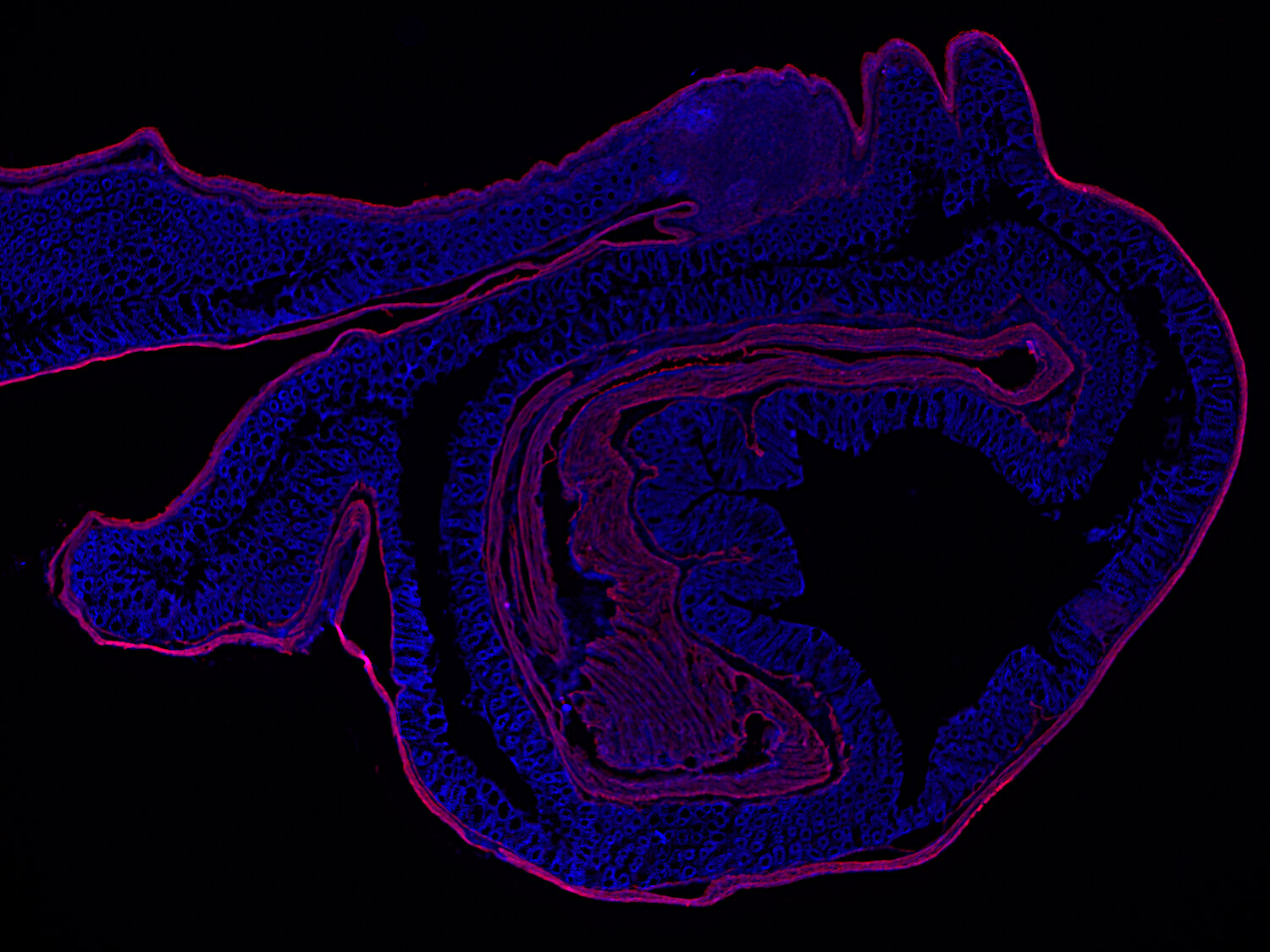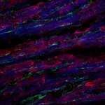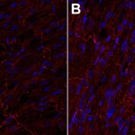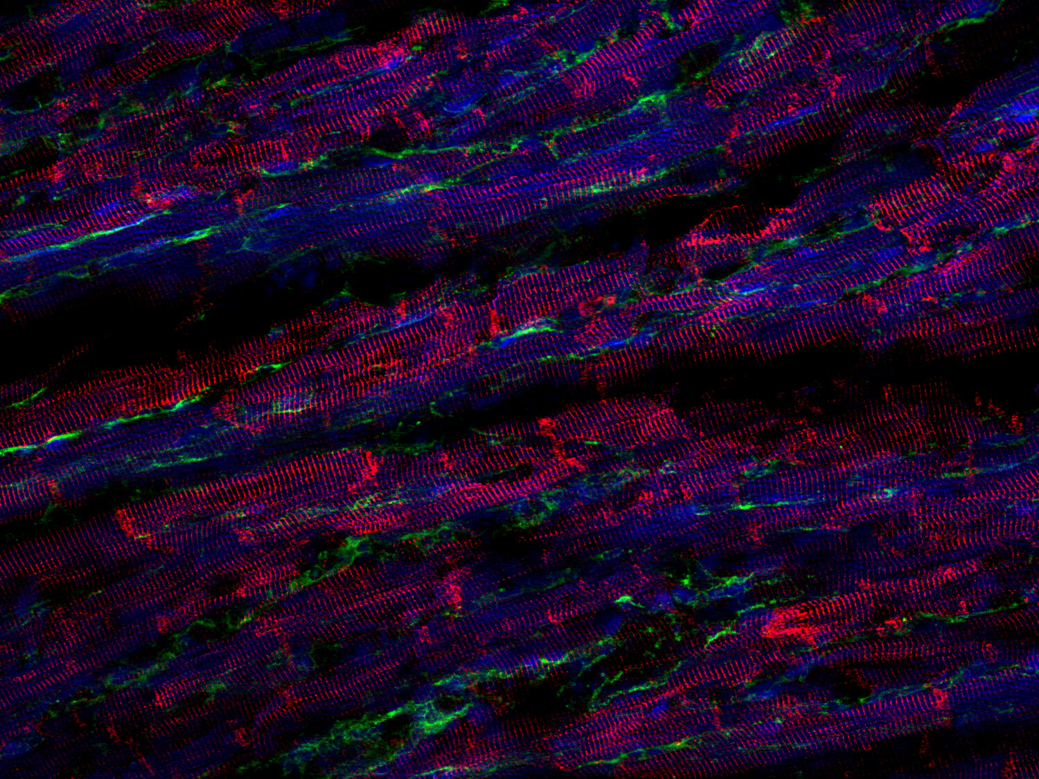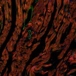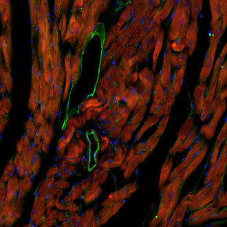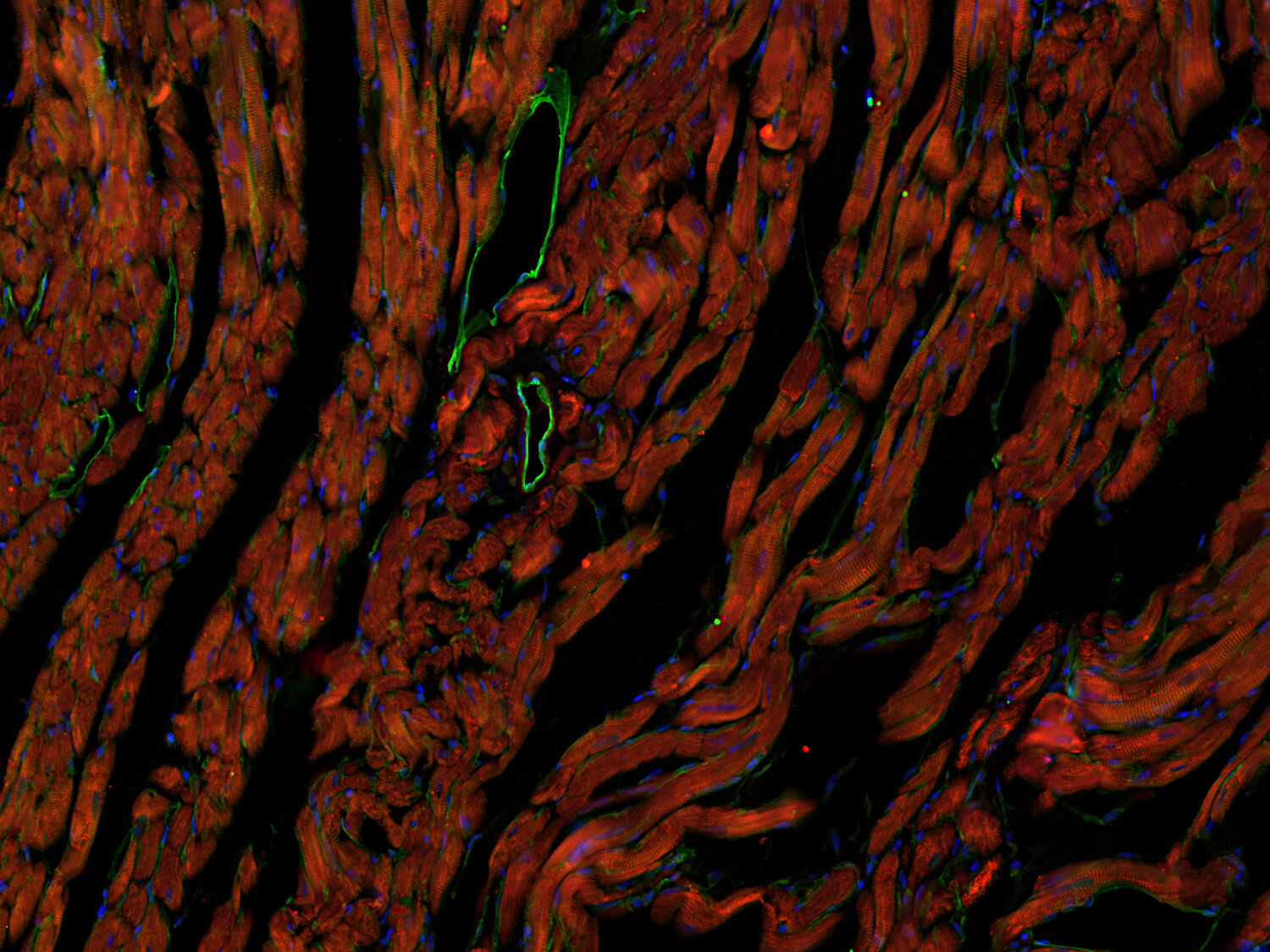 Expression of Desmin in cardiomyocytes (red) and CD31 in vascular endothelial cells (green) in a mouse heart.