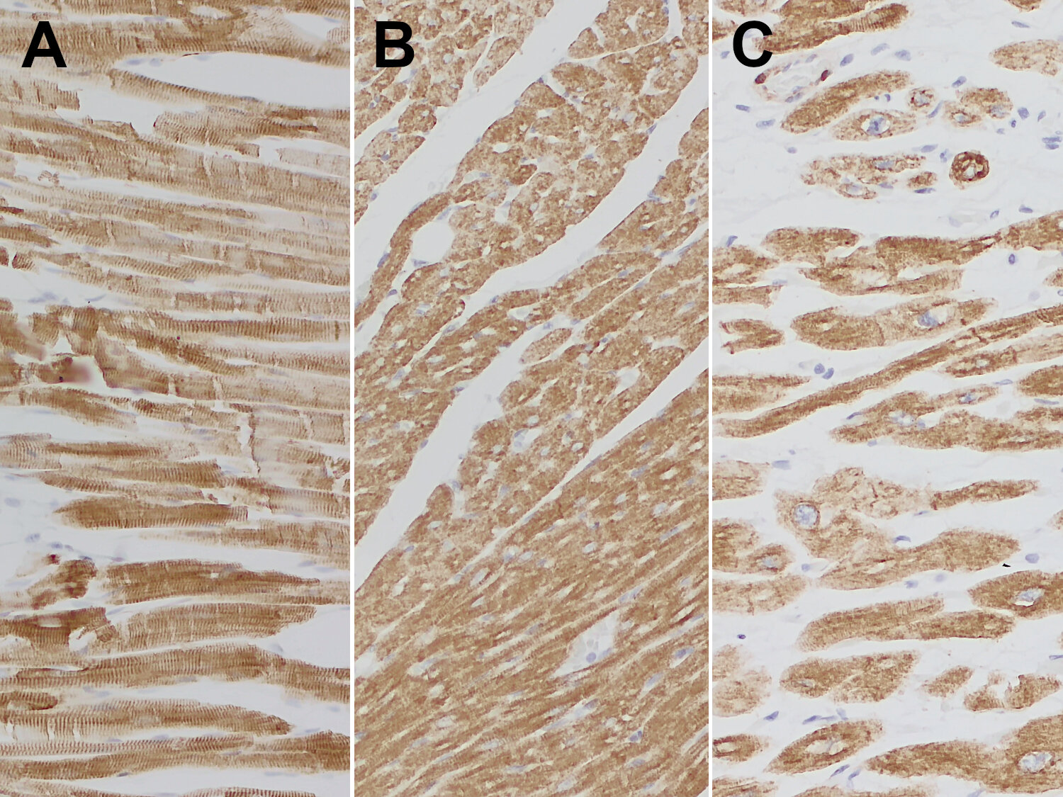 Desmin is the most important muscular intermediate filament (IF) and is expressed in cardiac, skeletal and smooth muscles. Desmin IFs envelop myofibrils at the level of Z-disks and extend from the nuclear envelope to the sarcolemma and various organelles such as nuclei, mitochondria, and the sarcoplasmic reticulum (1). In this way, desmin IFs contribute to structural and mechanical support, cellular integrity, force transmission, and mitochondrial homeostasis (1). Desmin knockout-mice develop normally and are fertile. However, after birth mice develop cardiovascular lesions and skeletal myopathy (2). Studies in these mice suggest that desmin is not required for myogenic commitment, differentiation or fusion, but is essential for maintaining the tensile strength and integrity of muscle fibers (3). In humans, missense mutations in the desmin gene (DES) also cause a distinct “desmin myopathy”, which is often associated with cardiomyopathy (4).