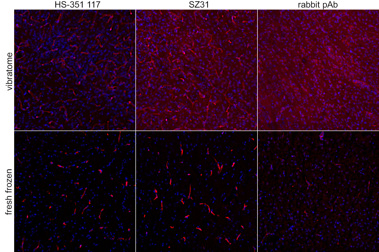 Blood vessels in free-floating FA perfusion fixed mouse brain sections (Figure 3, first row) were selectively stained with the rat monoclonal antibodies (rat mAbs) HS-351 117 and SZ31. However, SZ31 showed weak nuclear background staining, which was not present in the brain section stained with rat mAb HS-351 117. The polyclonal rabbit antibody (rabbit pAb) failed to stain blood vessels in free-floating FA perfusion fixed mouse brain sections. In post-fixed fresh frozen mouse brain sections, all tested antibodies revealed clean blood vessel staining (Figure 3, second row), although staining with the rb pAb was significantly weaker.