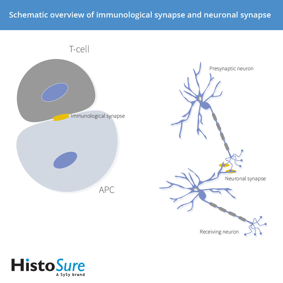 An immunological synapse (IS) can be defined as the orderly rearrangement of molecules in an immune cell at the interface with another cell (Orange, 2008). ISs are found between antigen-presenting cells (APCs) or target cells and lymphocytes such as a T-cells, B cells or Natural Killer cells. This interaction is essential for the defense against a wide range of pathogens and deranged host cells. Dysregulation of this interaction makes the host susceptible to pathogens or tumor escape at one extreme and autoimmunity at the other (Dustin, 2014). IS and neural synapses share properties such as the synaptic cleft, adhesion molecules, stability and polarity (Figure 1), however interactions between immune cells are only short-lived and last from minutes to hours (Friedl et al., 2004).