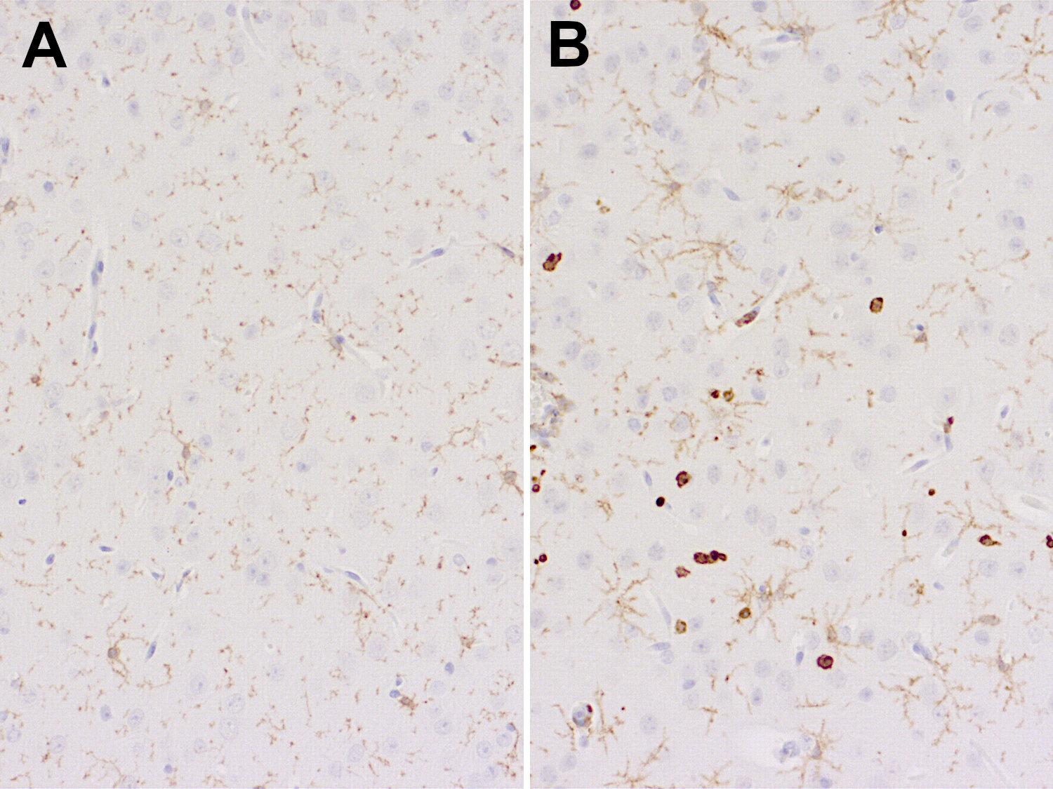 Figure 6: Immunohistochemical staining of formalin-fixed paraffin-embedded mouse brain sections from A: a non-infected PBS control mouse and B: K18-hACE2 transgenic mouse with rat anti-CD11b (cat. no. HS-384 117, dilution 1:200, DAB). Nuclei have been counterstained with hematoxylin (blue).
