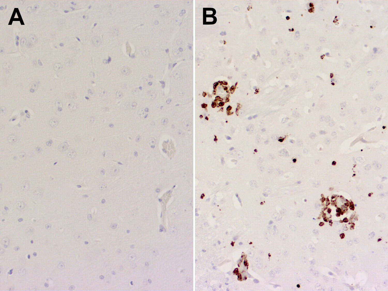 Figure 5: Immunohistochemical staining of formalin-fixed paraffin-embedded brain sections from K18-hACE2 transgenic mice B: infected with SARS-CoV-2 or A: non-infected control using the monoclonal anti-Sars-Cov-2 nucleocapsid antibody clone #53E2 (cat. no. HS-452 111, dilution 1:1000; DAB). Nuclei have been counterstained with hematoxylin (blue).